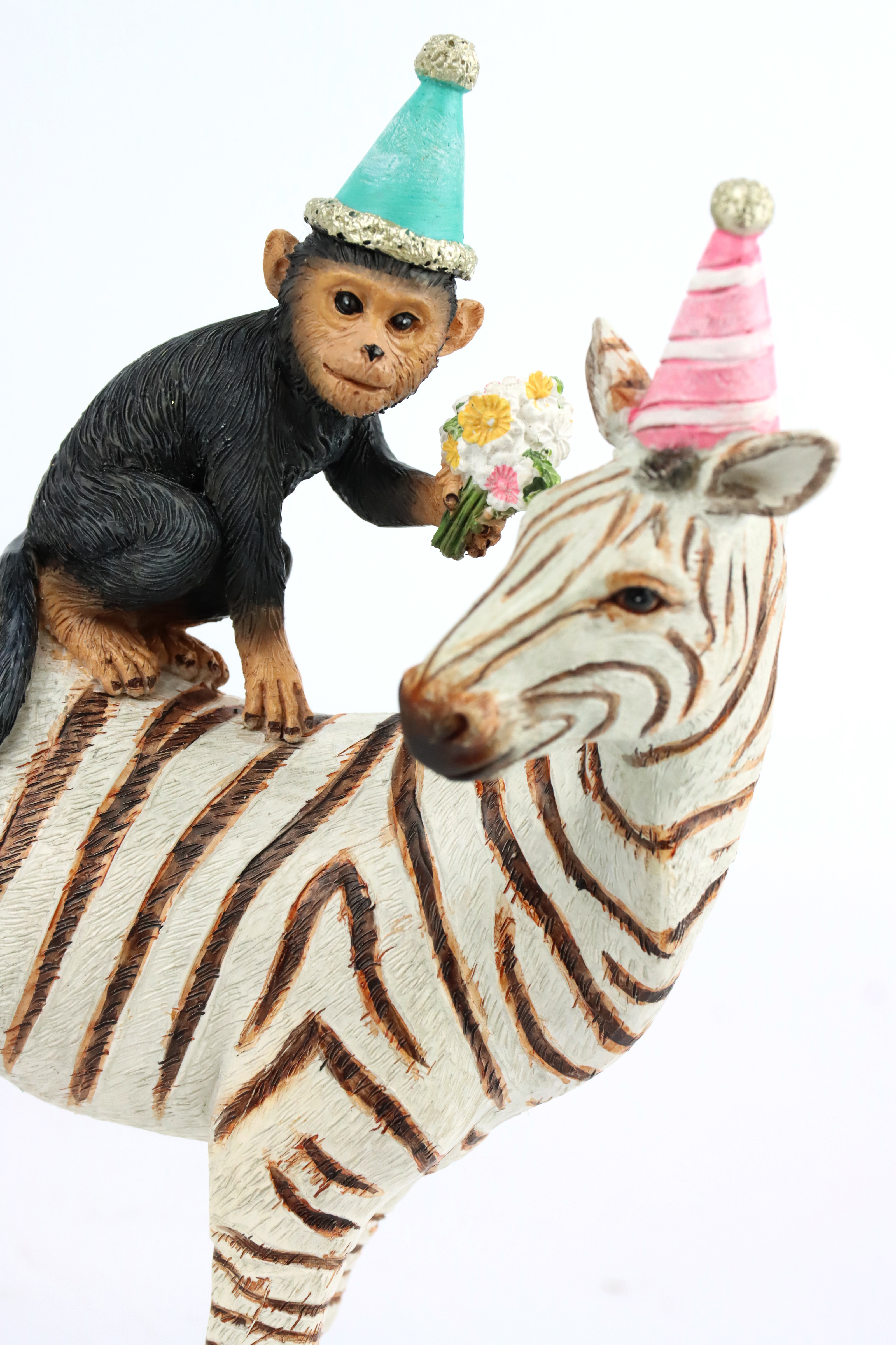 - **Einzigartiges Design**: Zebra mit Affe im Partyhut – ein Hingucker in jeder Dekoration.