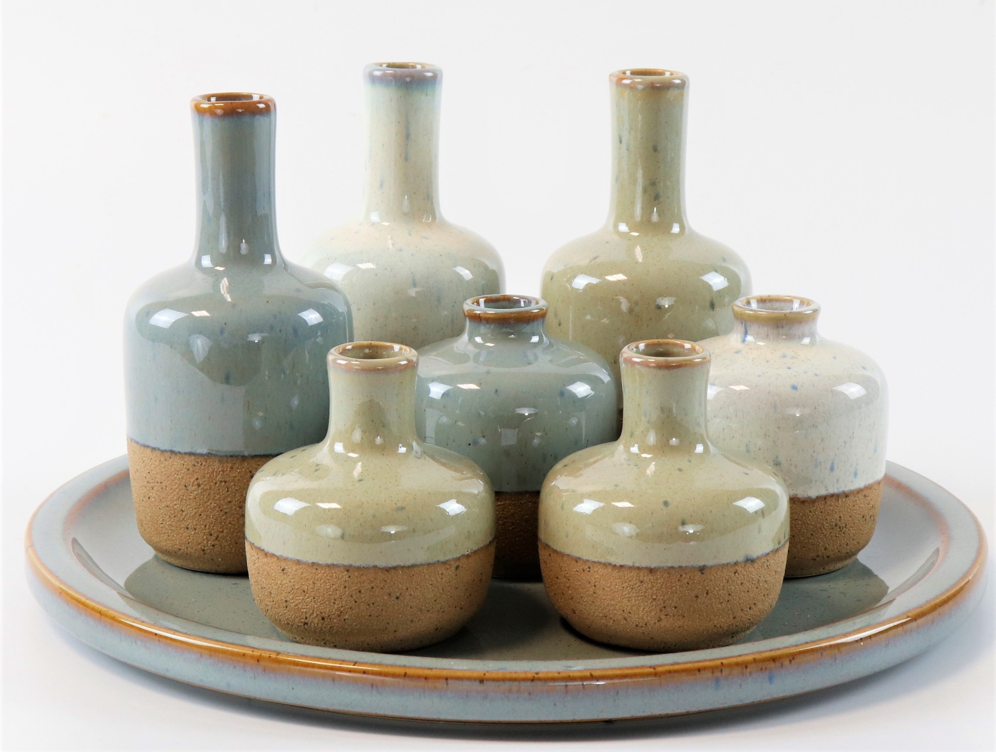Entdecken Sie das exquisite Vasenensemble "Skagen" S/8, das speziell entworfen wurde, um Ihrem Wohnraum im Frühling und Sommer ein frisches und einladendes Ambiente zu verleihen. Diese einzigartige Kollektion aus acht stilvollen, handgefertigten Keramikvasen wird auf einer eleganten Keramikplatte mit einem Durchmesser von 28 cm präsentiert und ist das perfekte Highlight für jeden Wohn- oder Geschäftsbereich. Die ansprechenden Creme- und Blautöne des Ensembles fügen sich mühelos in fast jedes Dekorationsschema ein und ziehen die Blicke Ihrer Kunden auf sich.