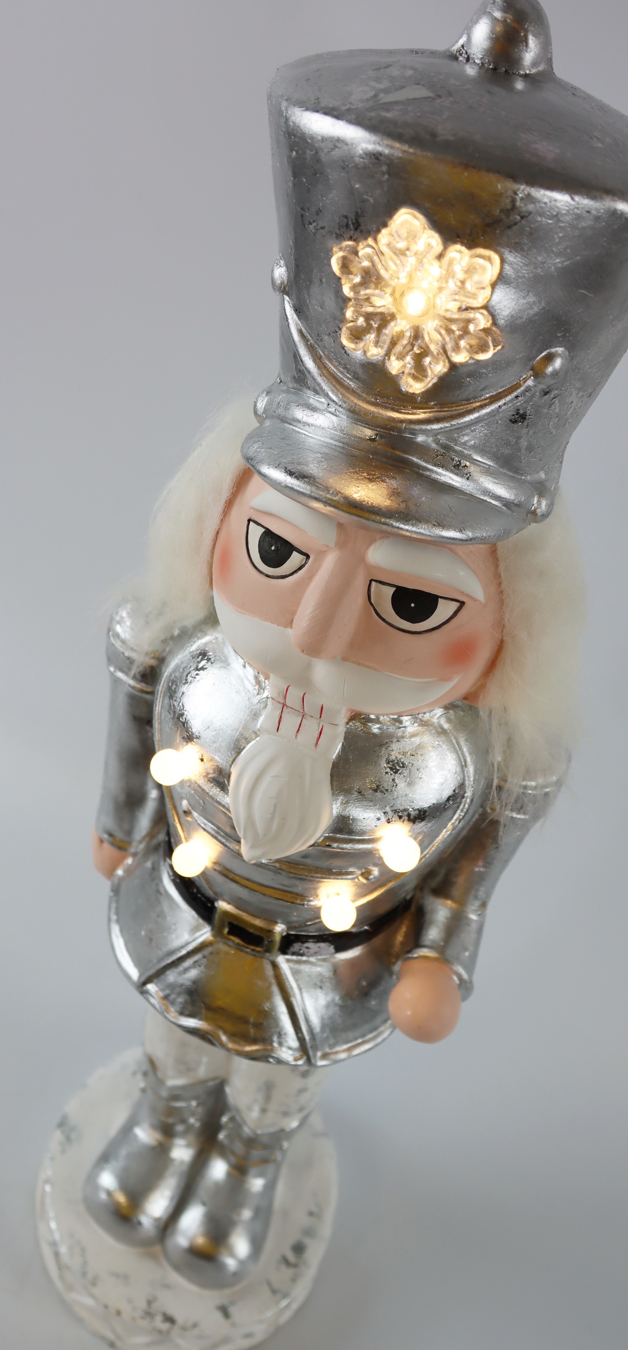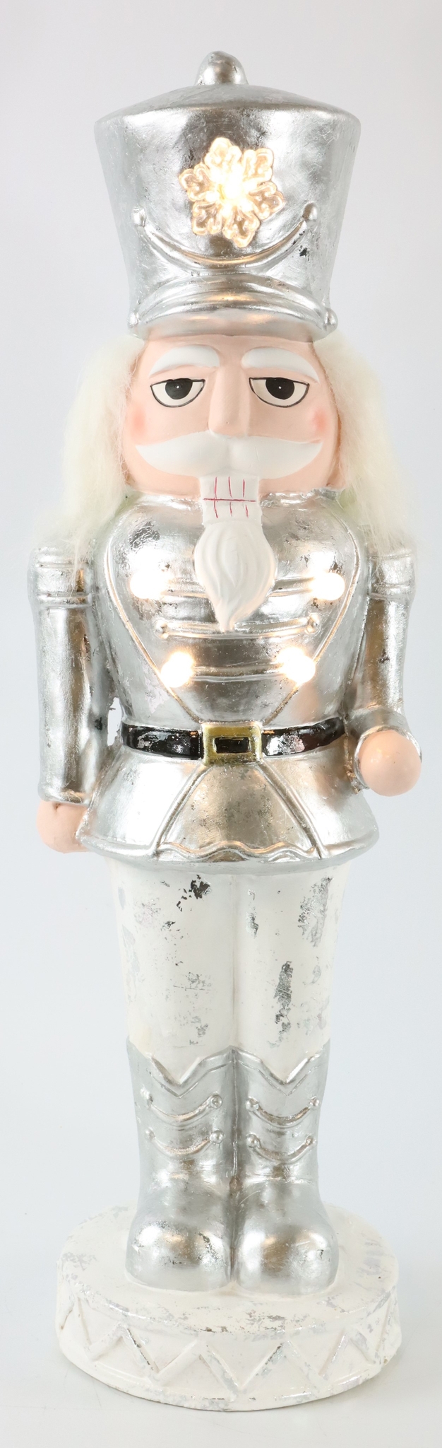 Entdecken Sie die perfekte Weihnachtsdekoration für Ihr Geschäftslokal: die LED-Figur "Nussknacker" in edlem Silber, Artikelnummer 4684. Dieses stilvolle Dekorationsstück aus hochwertiger Magnesia und Keramik zieht alle Blicke auf sich und verleiht jeder Umgebung einen festlichen Glanz. Mit einer beeindruckenden Höhe von ca. 60 cm ist dieser batteriebetriebene Nussknacker ein imposantes Highlight in jeder Auslage und schafft eine festliche Atmosphäre, die Ihre Kunden begeistern wird.