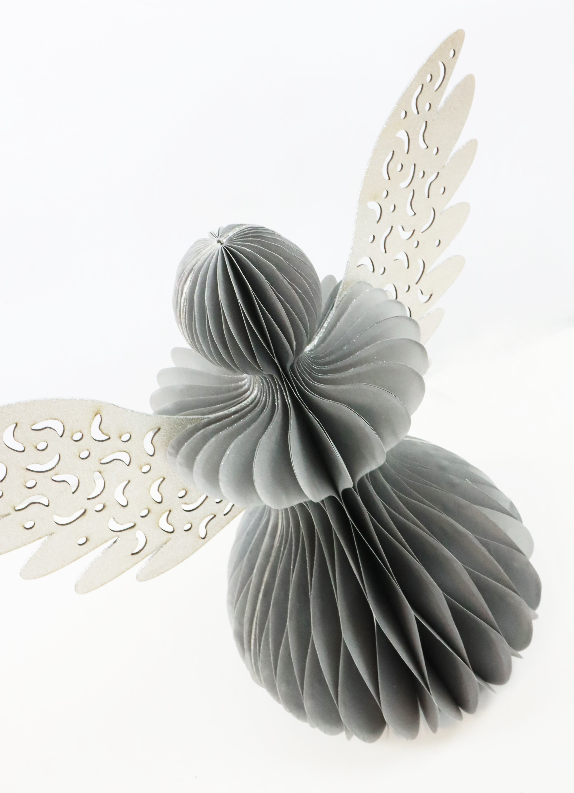 Erleben Sie die festliche Saison mit unserem eleganten Dekoengel "Honeycomb". Als Artikelnummer 9237 in unserem Online-Shop erhältlich, ist dieser faltbare graue Engel mit silbernen Flügeln aus Papier eine exzellente Ergänzung für jederlei Weihnachtsdekoration.