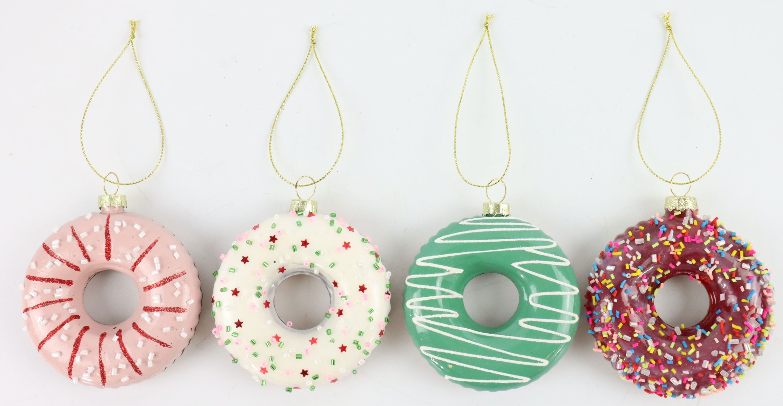 Keywords: Glasschmuck, Donut, Weihnachtsdekoration, Wohnen und Lifestyle, Einzelhandel, handgefertigt, 4-teiliges Set, Anhänger, hochqualitativem Glas, Weihnachtsbaumschmuck, traditionell, modern, Einzigartigkeit, Weihnachtsbaum, der Weihnachten.