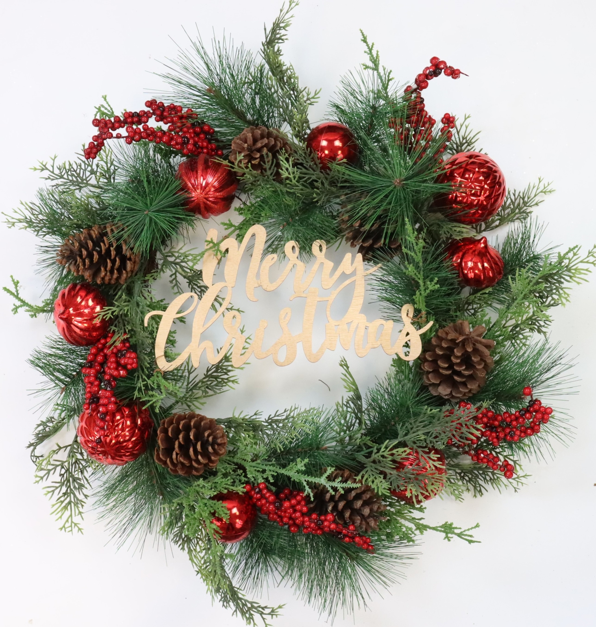 Für zusätzlichen Charme sorgt der in den Kranz integrierte Schriftzug "Merry Christmas", der in eleganter Schrift gestaltet wurde und jedem Kunden beim Betreten Ihres Geschäfts ein herzliches Willkommensgefühl vermittelt. Die leuchtenden Farben und das ansprechende Design sorgen dafür, dass dieser Zierkranz alle Blicke auf sich zieht und garantiert zum Highlight Ihrer Weihnachtsdekoration wird.