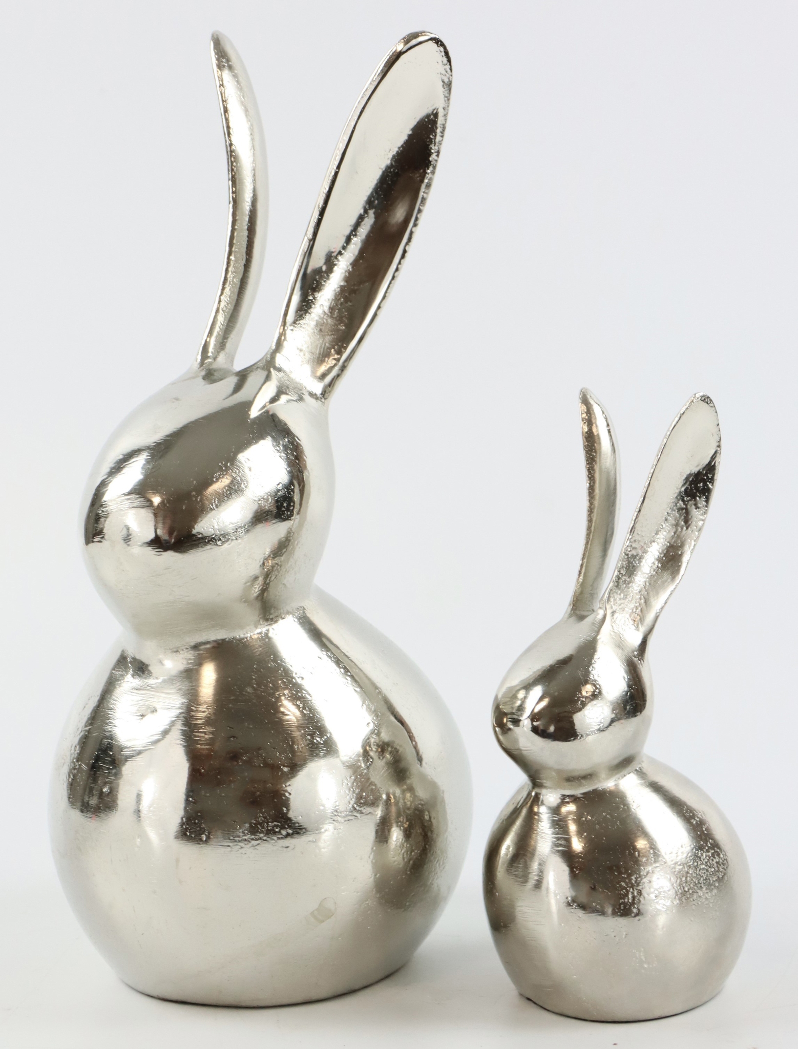 Die Größen der Hasen sind auf unterschiedliche Höhen ausgelegt – ein Hase misst circa 15 cm und der andere stattliche 24 cm. Dies ermöglicht eine dynamische Präsentation, die verschiedene Ebenen schafft und so das Interesse Ihrer Kunden weckt. Durch das Zusammenspiel von Höhendifferenz und dem glänzenden Silber, das Licht reflektiert, werden diese dekorativen Hasen zu einem stilvollen Blickfang in jeder Umgebung.