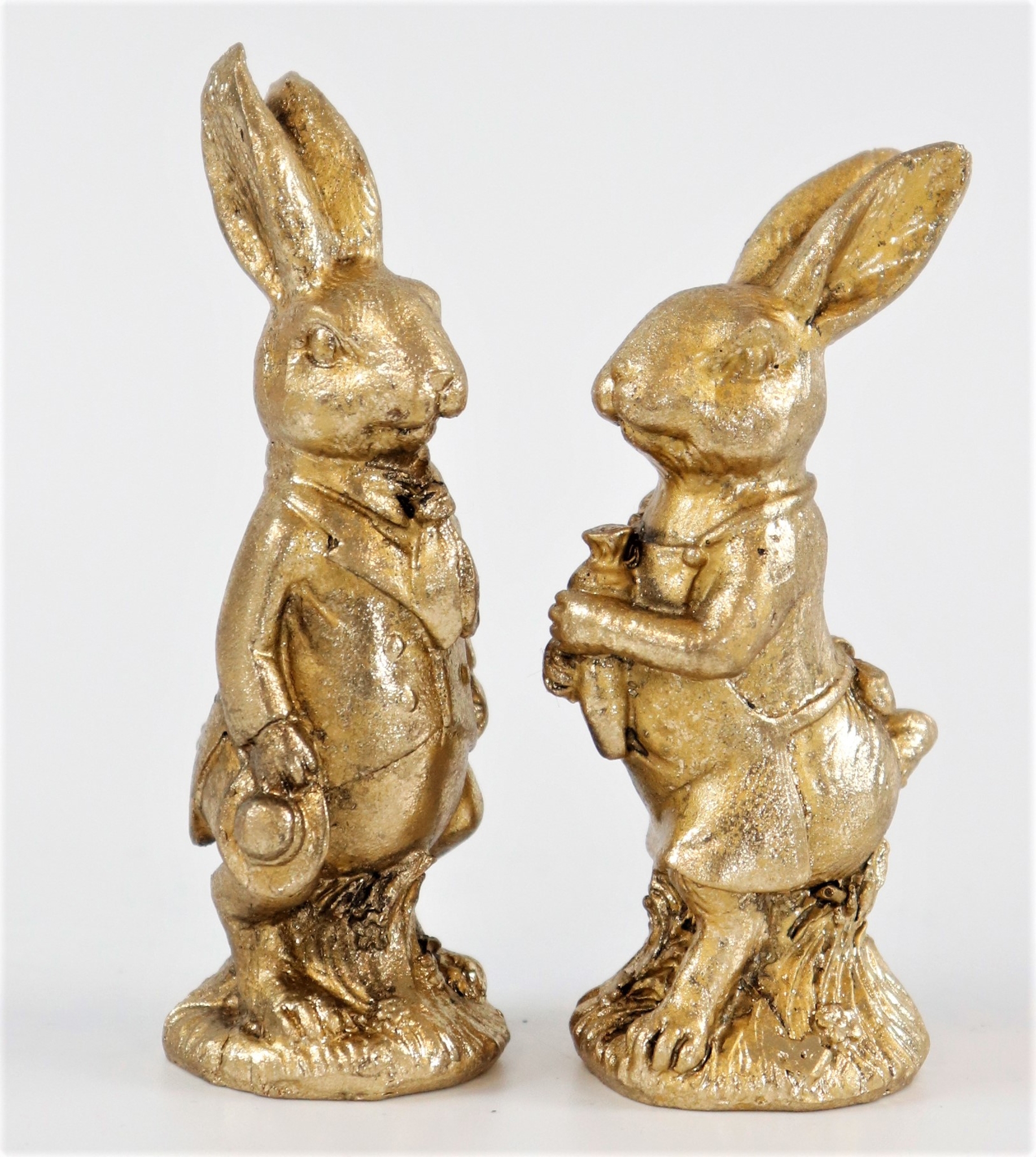 Mit dem nostalgischen Design und der glänzenden Goldfarbe ziehen die Hasen alle Blicke auf sich und sind ideal für dekorative Arrangements in Schaufenstern, Verkaufsräumen oder als Blickfang im Wohnbereich. Polyresin, ein halbfester Kunststoff, der für seine Robustheit und Beständigkeit bekannt ist, garantiert, dass diese Osterdekoration viele Jahre lang Freude bringt.