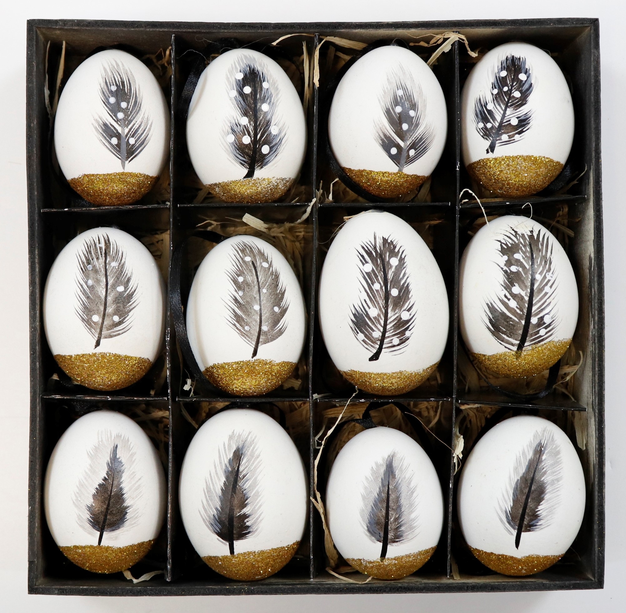 - **12-teiliger Set**: Enthält echte Eier mit Federmotiv für ein einzigartiges Dekor.