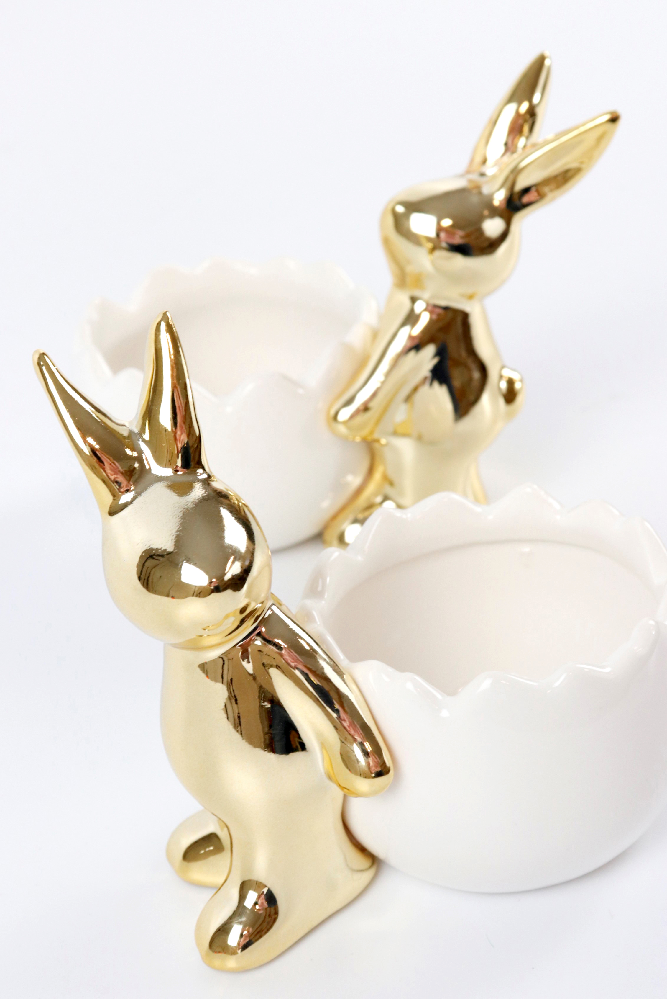 Jeder Ständer in diesem Set ist kunstvoll aus hochwertigem Porzellan gefertigt und misst etwa 10 cm. Die elegante goldene Kranzverzierung verleiht den Eierständern einen Hauch von Luxus, der sowohl in modernen als auch in traditionellen Umgebungen perfekt zur Geltung kommt. Das dezente, aber auffällige Design macht sie zu einem Must-have für jede Osterdekoration und stellt sicher, dass Ihre festliche Präsentation immer im richtigen Licht erscheint.
