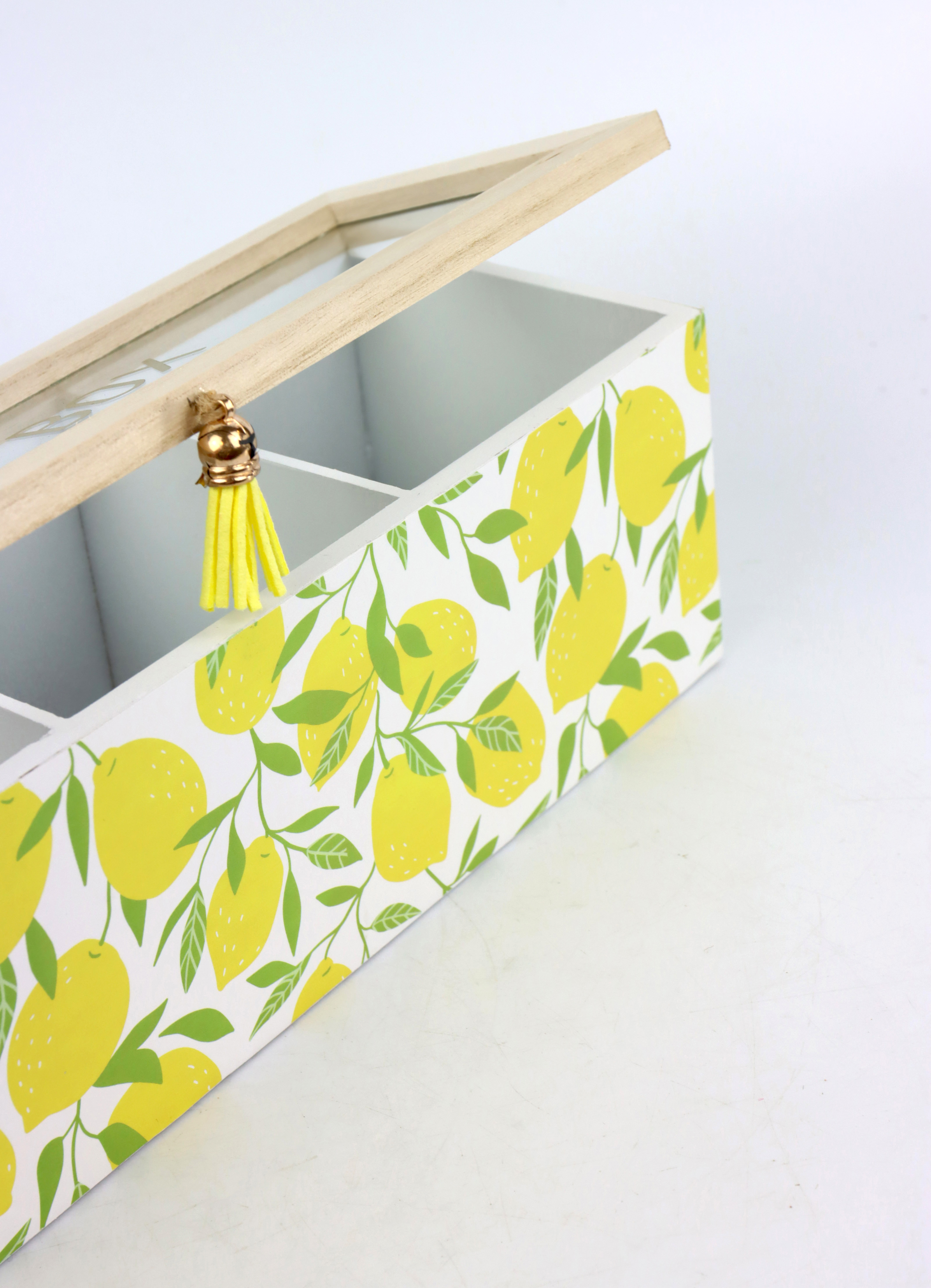 Made of high-quality wood and fine glass, the "LUCKY LEMON" TEEBOX brings freshness and elegance to your shop or café. With a generous size of around 28 cm, it fits perfectly on any shelf or in any display case without taking up too much space. The spring-like lemon motif on the surface lightens up the design and exudes a touch of summer and good humour. This tea box is therefore not only a practical storage place, but also a real eye-catcher in your shop.