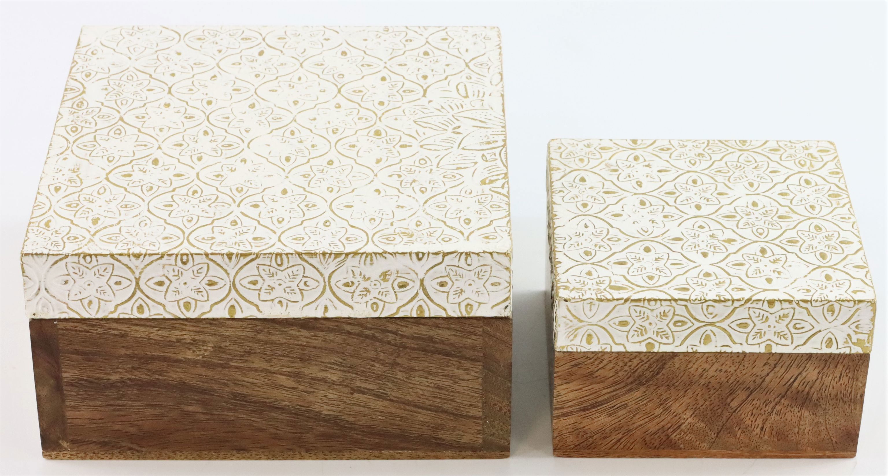 - Set of two wooden boxes, each approx. 15 cm tall.
