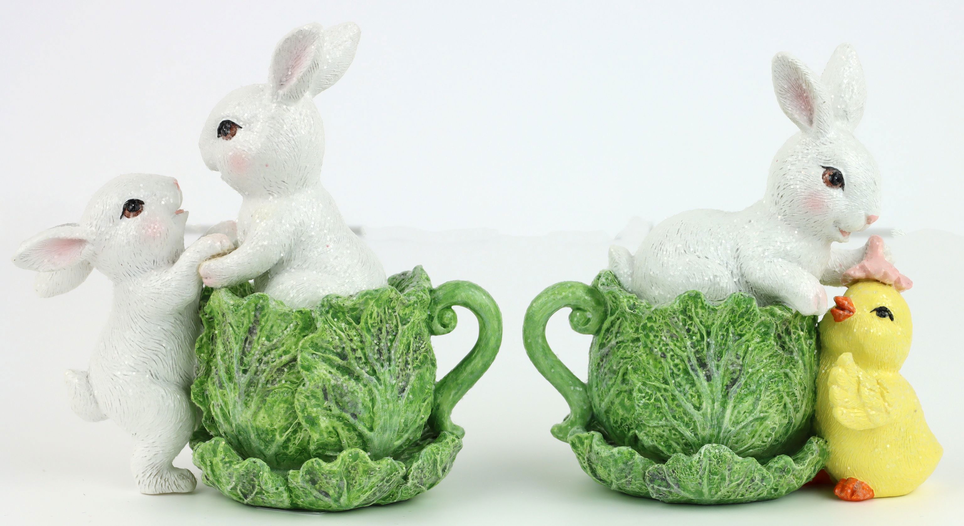 Discover the magical world of Easter with our BUNNY CUPS "CABBUNNY" in a set of 2! These delightful decorative elements embody the joy and playfulness of spring and are a must-have for every stationary retail range in the home and lifestyle sector. The set consists of two lovingly detailed bunnies in cups made of high-quality polyresin and impresses with a size of approx. 12 cm each.