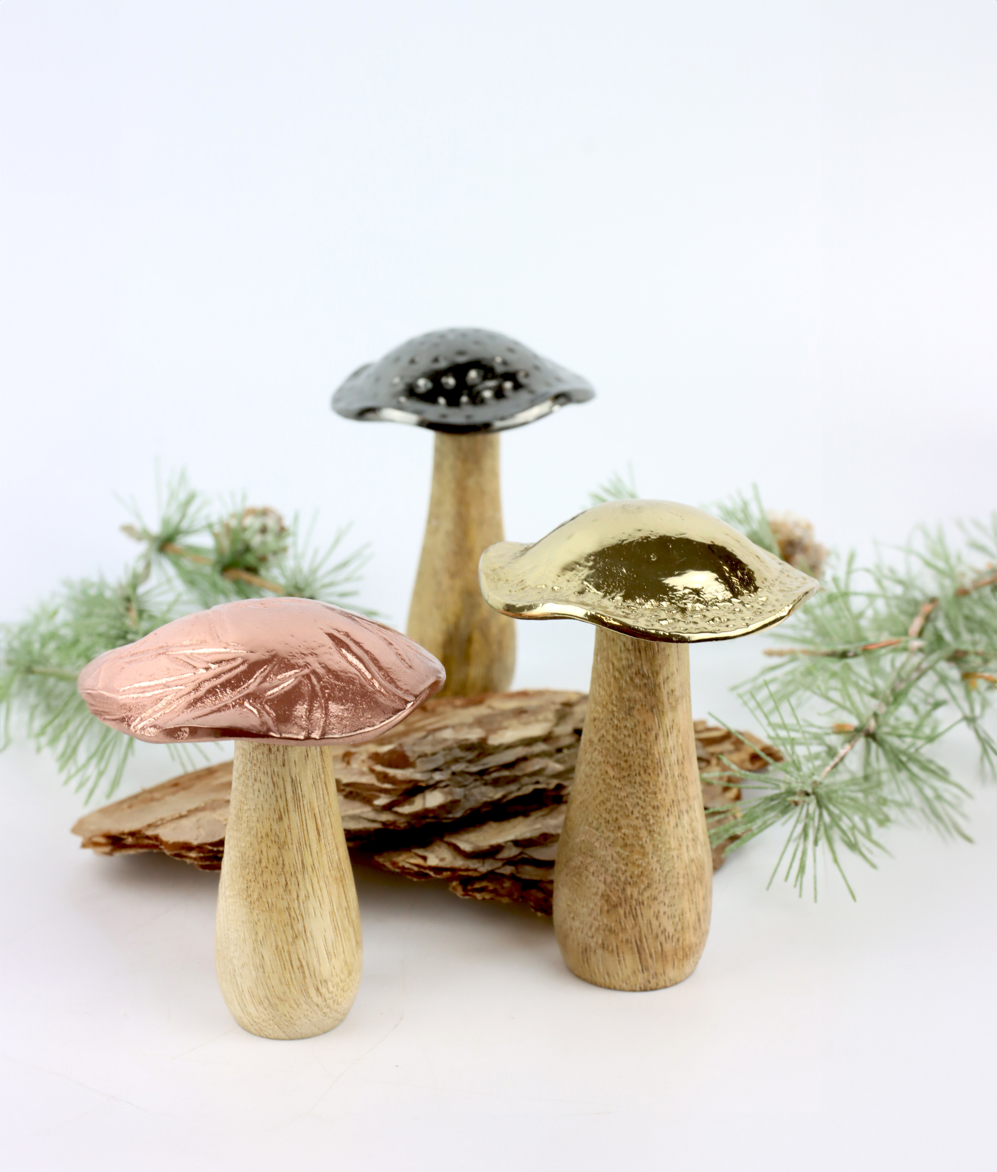 SEO-relevant keywords: decorative mushrooms ZAUBERWALD; 3-piece decorative mushroom set; item number 8560; autumn and winter decoration; aluminium and wood decoration; living and lifestyle product; natural table decoration.