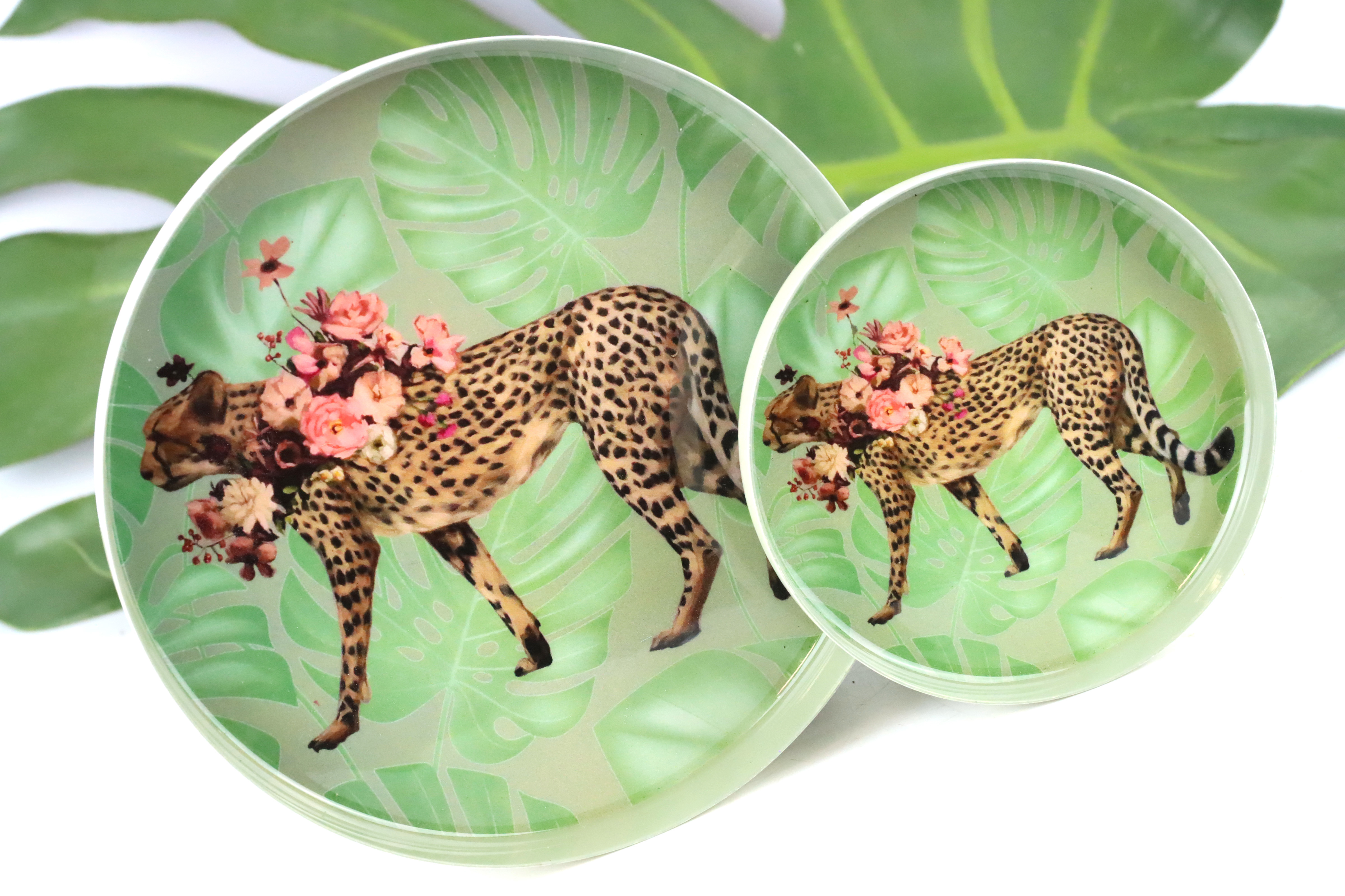 El motivo de leopardo con una colorida cadena floral en la superficie confiere a estas bandejas un aspecto único. Perfectas para temas como el exotismo, el safari o la elegancia botánica, ¡este diseño es absolutamente imprescindible! La representación detallada de los motivos garantiza un aspecto vivo que encantará a sus clientes.