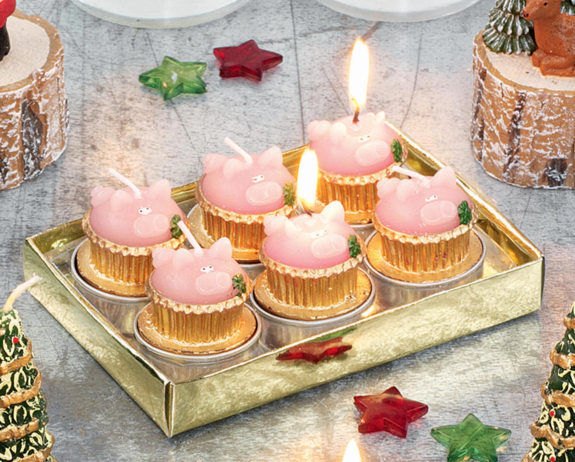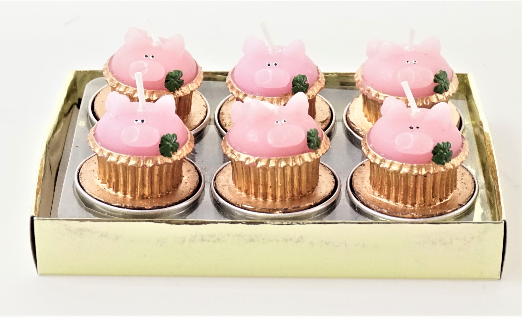 **Descripción del producto: Set de velas de té "Cerdo de la suerte" en oro - 6 piezas**