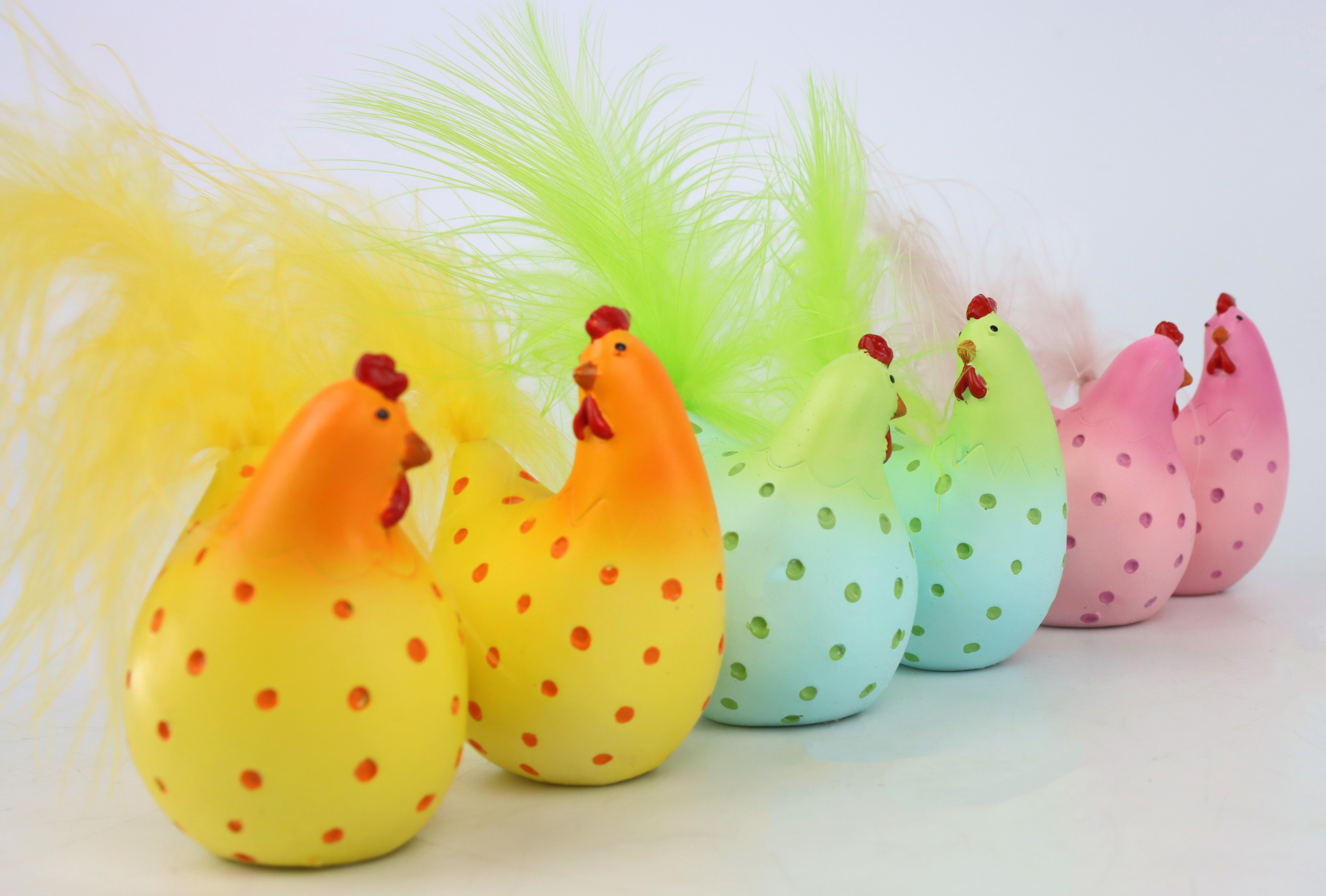 Estos adorables pollos están especialmente diseñados para la temporada de Pascua, pero irradian una ternura atemporal que resistirá el paso del tiempo. Cada uno de los pollos está decorado con divertidos lunares que dan al conjunto una textura única y un aspecto encantador. Estos alegres pollos añadirán un toque de frescura a cualquier entorno y levantarán el ánimo de sus clientes.