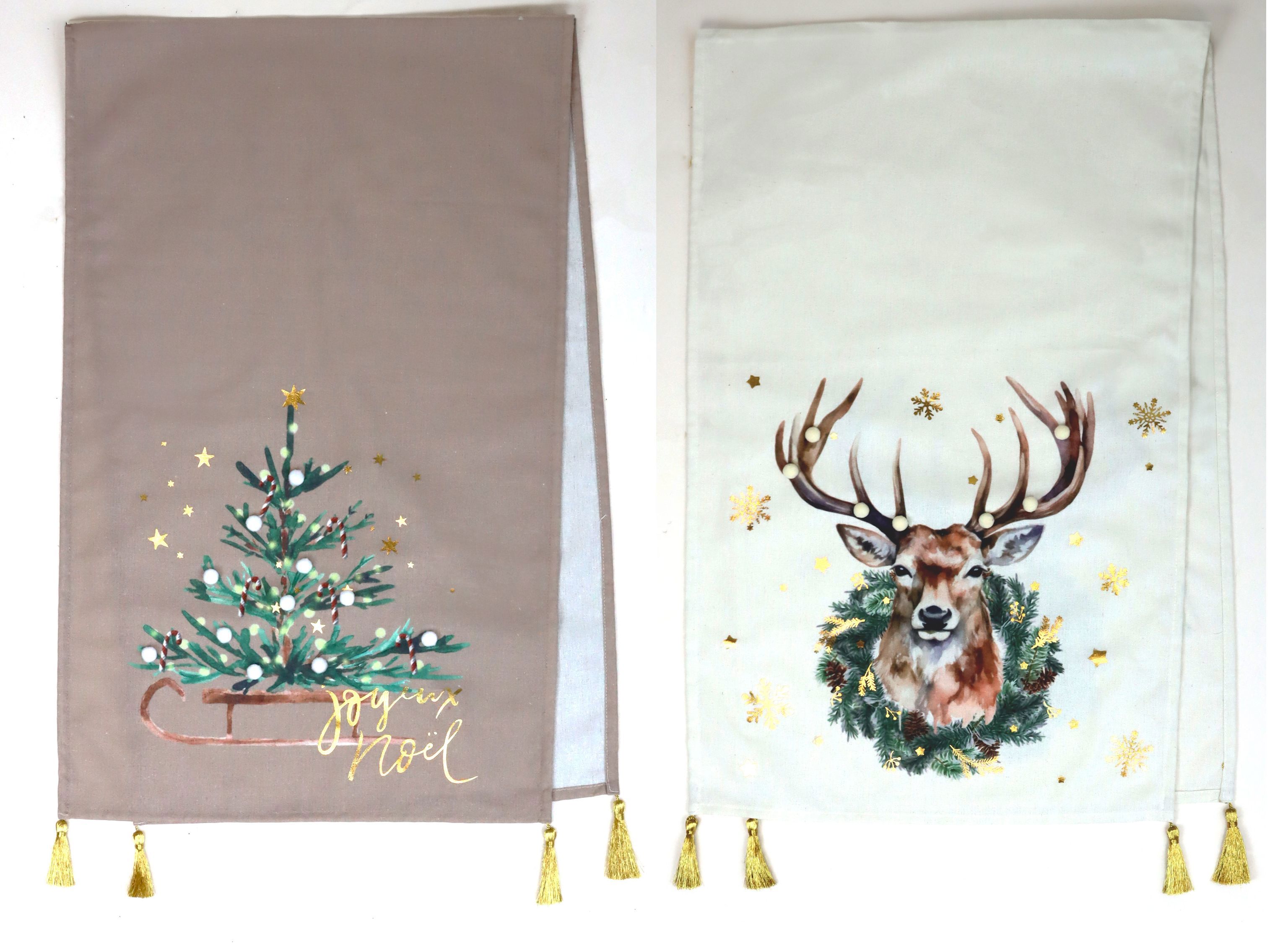 Plongez dans l'ambiance festive avec notre set exclusif de chemins de table "XMAS GROVE". Ce set élégant de 2 pièces, spécialement conçu pour la période de Noël, associe des motifs élégants de sapin de Noël et de tête de cerf dans des couleurs intemporelles - blanc et marron. Parfaits pour le commerce de détail stationnaire dans le domaine de la maison et du style de vie, ces chemins de table offrent une possibilité optimale de souligner l'atmosphère festive de chaque foyer tout en mettant en valeur le style décoratif de votre magasin.