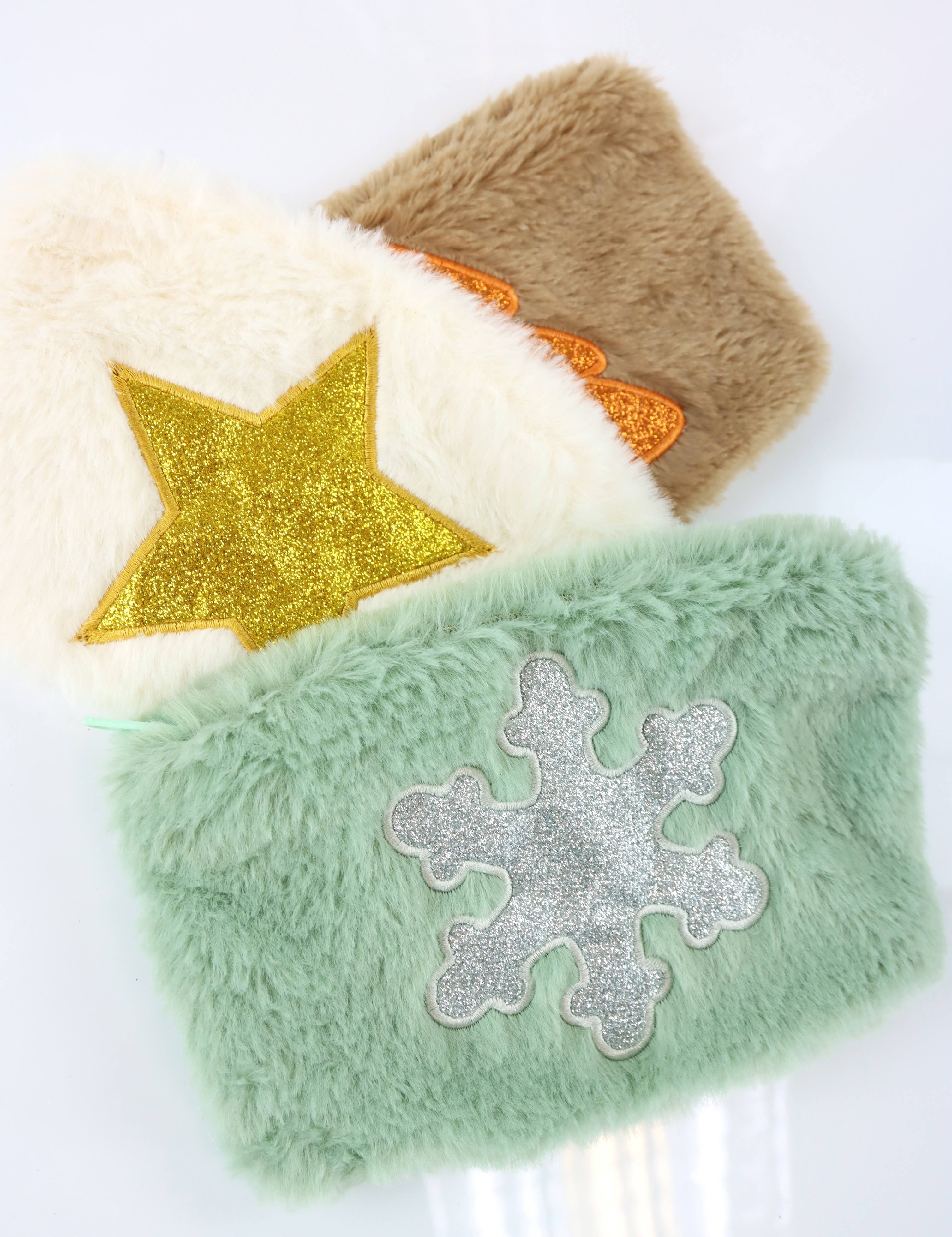 - **Set de trois pièces** : Contient des pochettes en fourrure dans les couleurs menthe, blanc et beige.