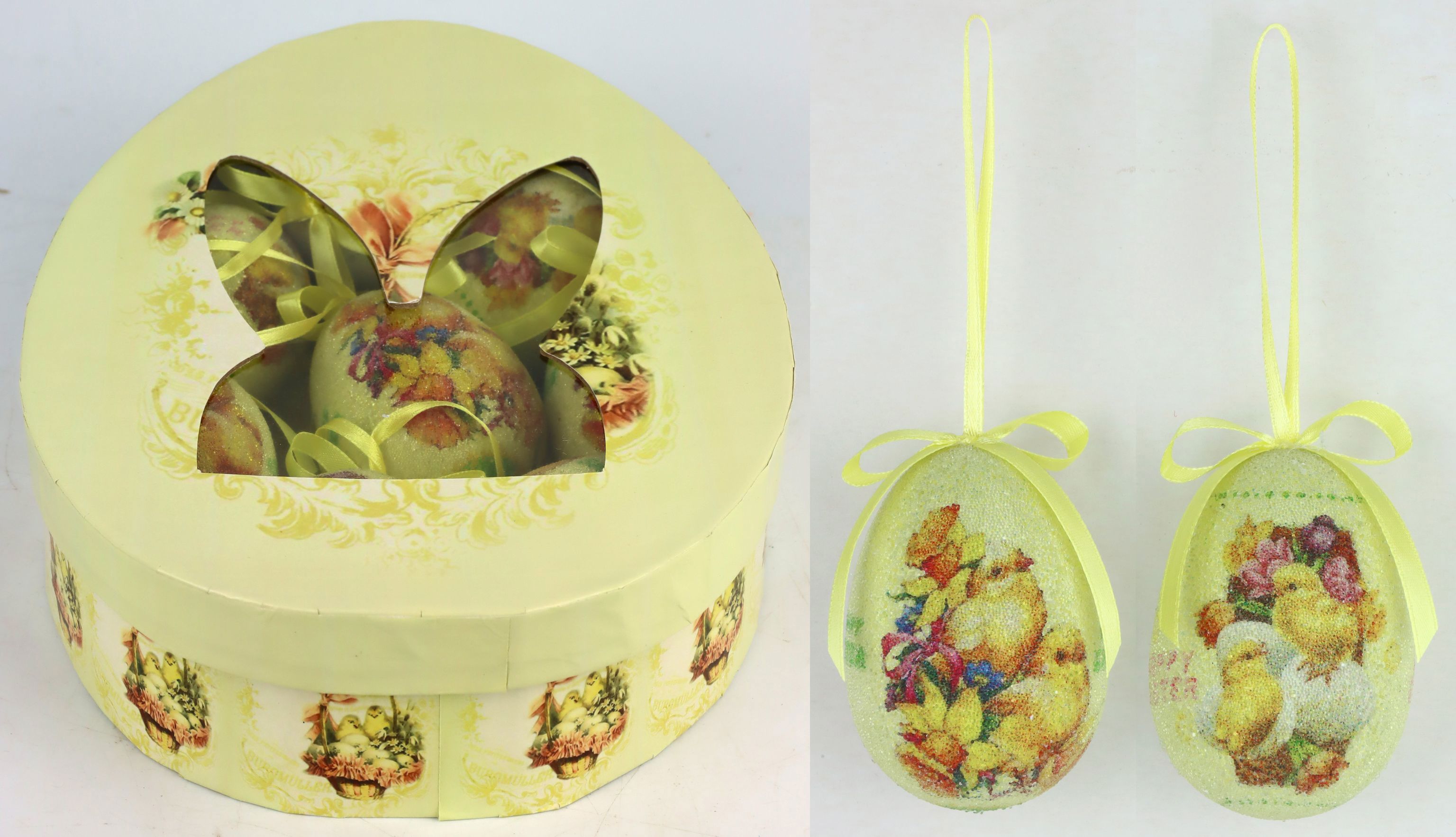 Pour la fabrication des œufs, on a utilisé du Polyfoam de qualité supérieure, un matériau non seulement robuste mais aussi léger, ce qui fait de ce produit un choix durable et pratique pour toute décoration de Pâques. La boîte, fabriquée en carton solide, complète l'ensemble tout en offrant la possibilité de stocker et de présenter les œufs en toute sécurité. Cette combinaison permet à votre segment de clientèle de détail d'acquérir un produit non seulement esthétique, mais aussi fonctionnel et facile à entretenir.