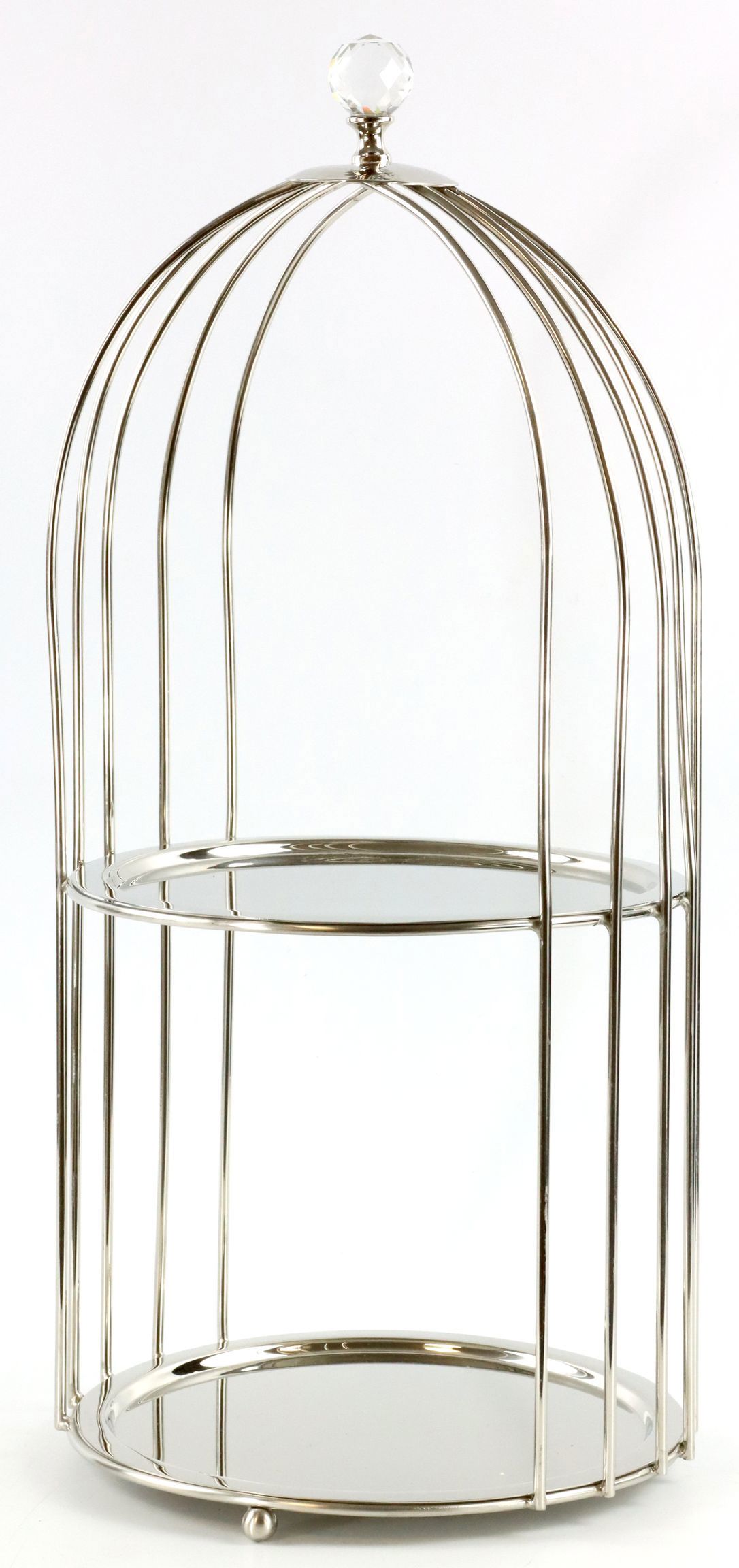 Experience the perfect synthesis of practical use and elegant design with our two-tier ETAGERE "CAGE" in attractive silver. This exquisite piece is ideal for stationary retail in the home and lifestyle sector and will undoubtedly attract the attention of your customers.