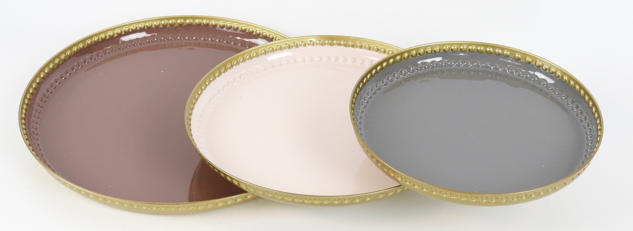 These beautiful tray bowls impress with a harmonious play of colours in brown, pink and grey. Made from robust metal, they are not only a real eye-catcher, but also particularly durable. The different sizes with a diameter of 31 cm, 25.5 cm and 21.5 cm allow for a variety of uses and make the set a versatile accessory for any interior.
