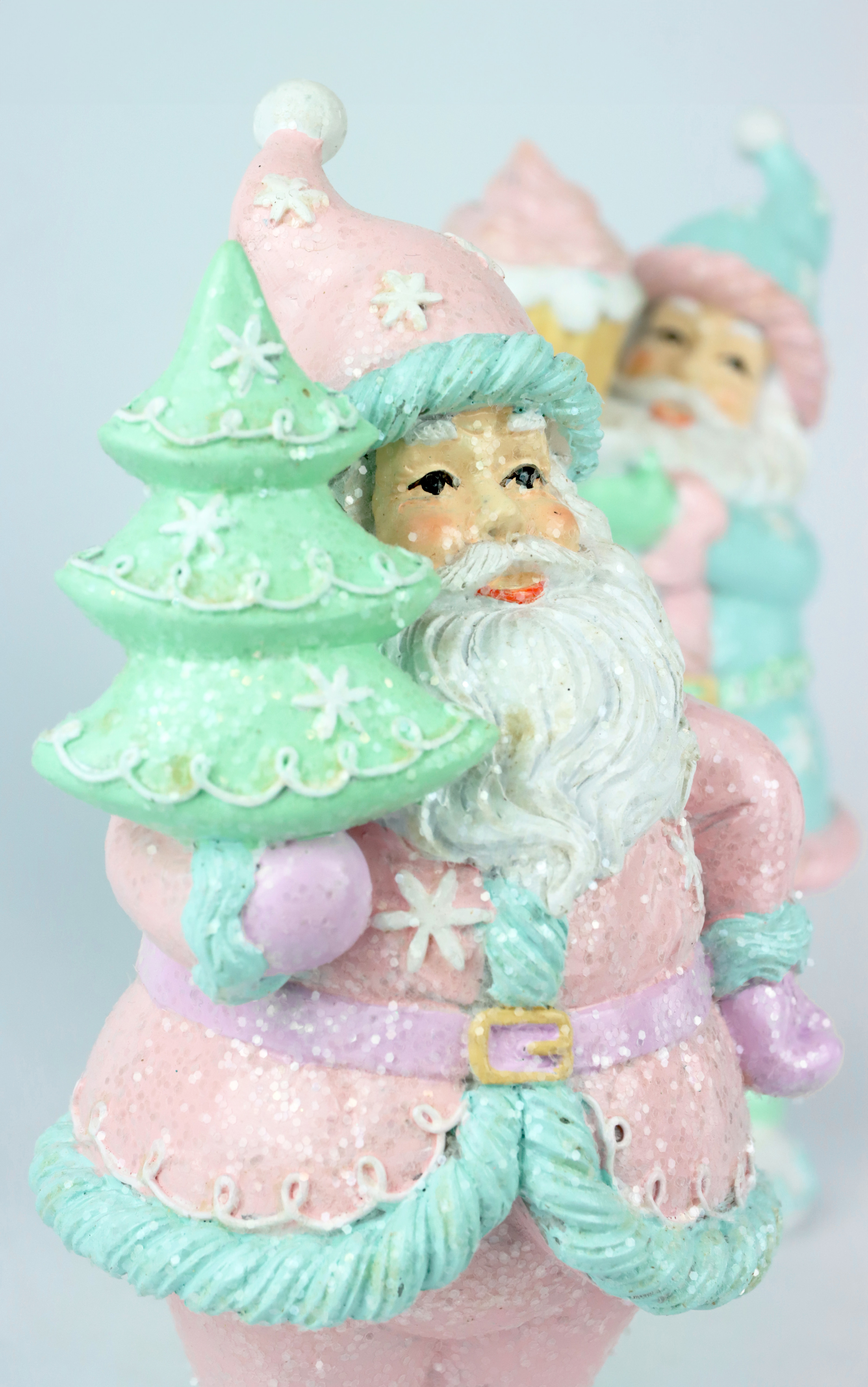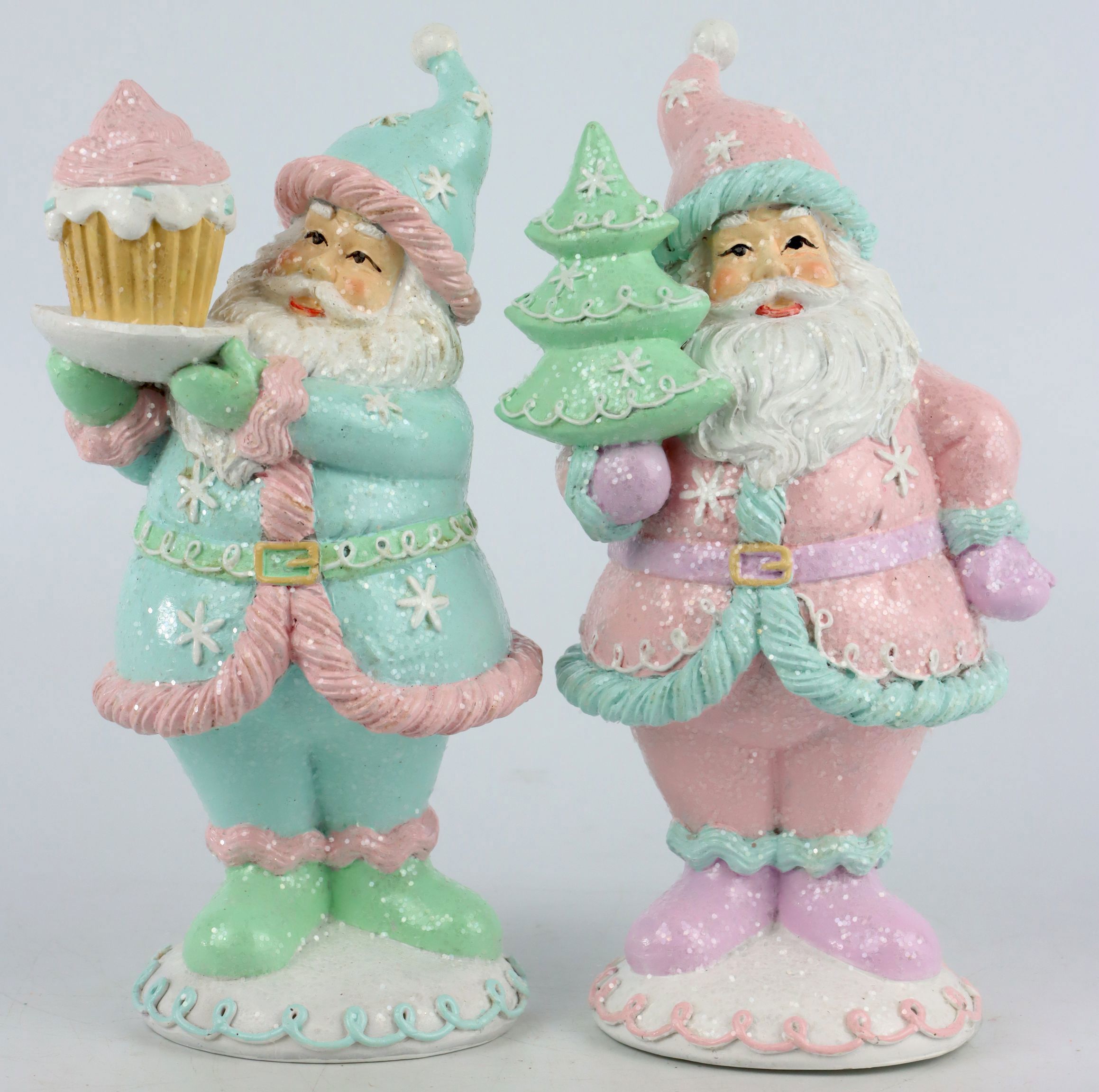 These Christmassy figures are designed in eye-catching turquoise and pink tones and add a touch of festive cheer to any room. Made from durable and attractive polyresin, these Santas stand proudly with their pretty accessories. One Santa is holding a sparkling Christmas tree, while the other presents an irresistible cupcake. With a stately size of around 22cm, they are sure to attract the attention of your customers.