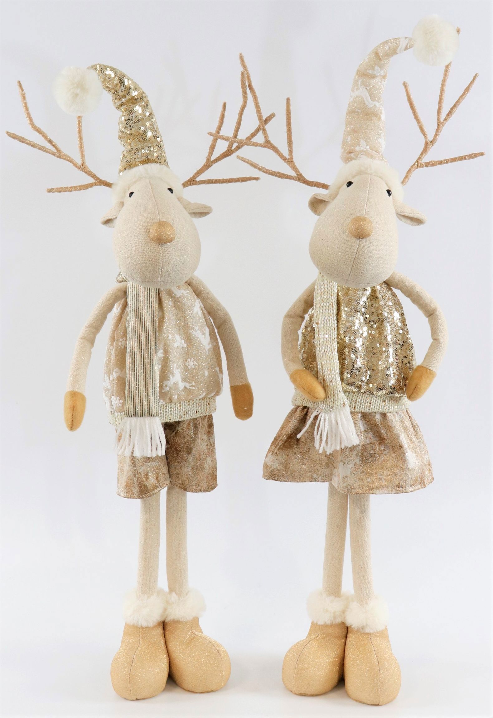 Discover the exquisite elk pair "Golden Dust" - a real eye-catcher for the festive season and a must-have for every retailer who wants to offer their customers exclusive home accessories. This two-piece set combines elegance and festive charm to perfection. At an impressive size of approx. 85 cm, the pair of moose fit seamlessly into festive decorations and enhance any shop window or in-house display.