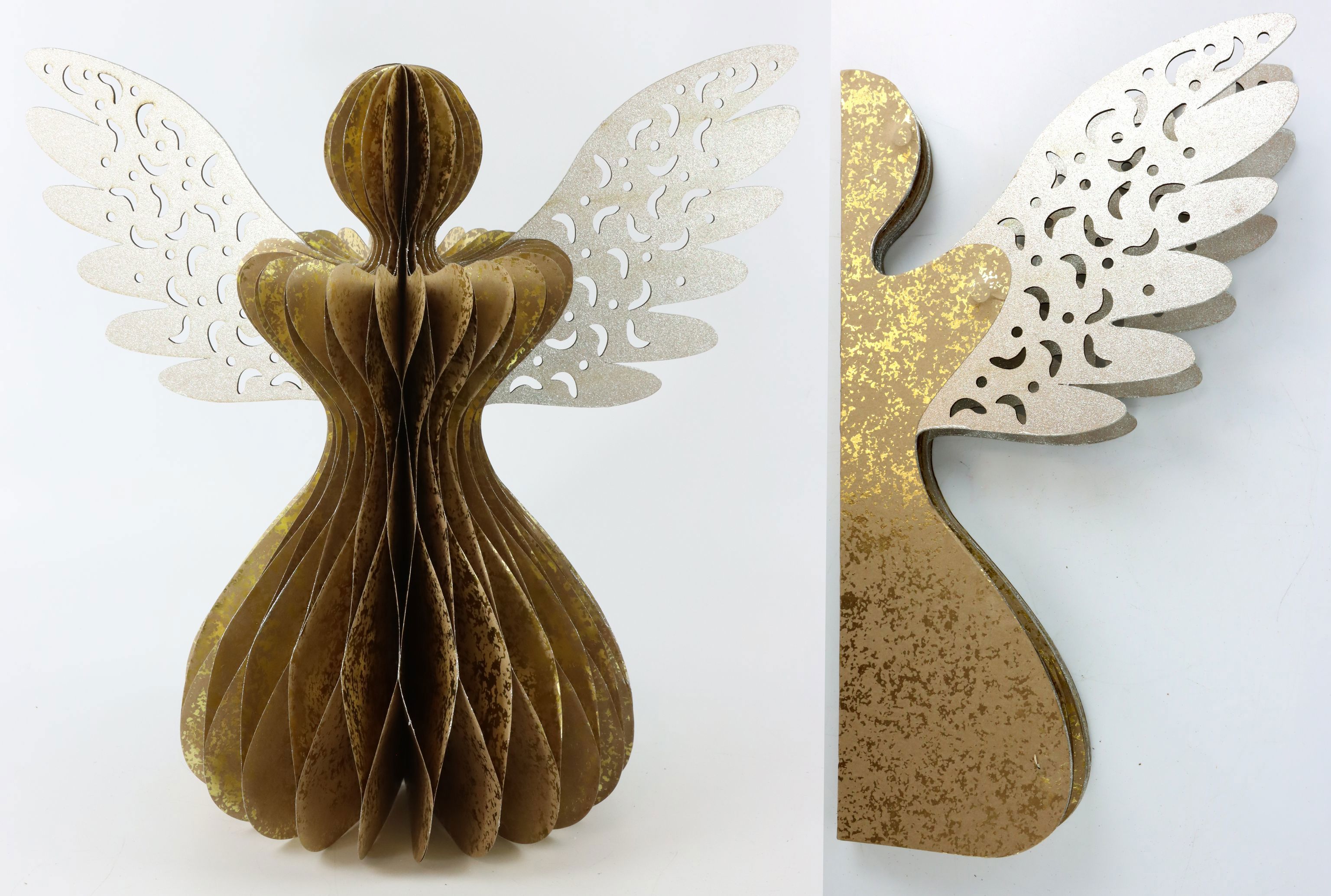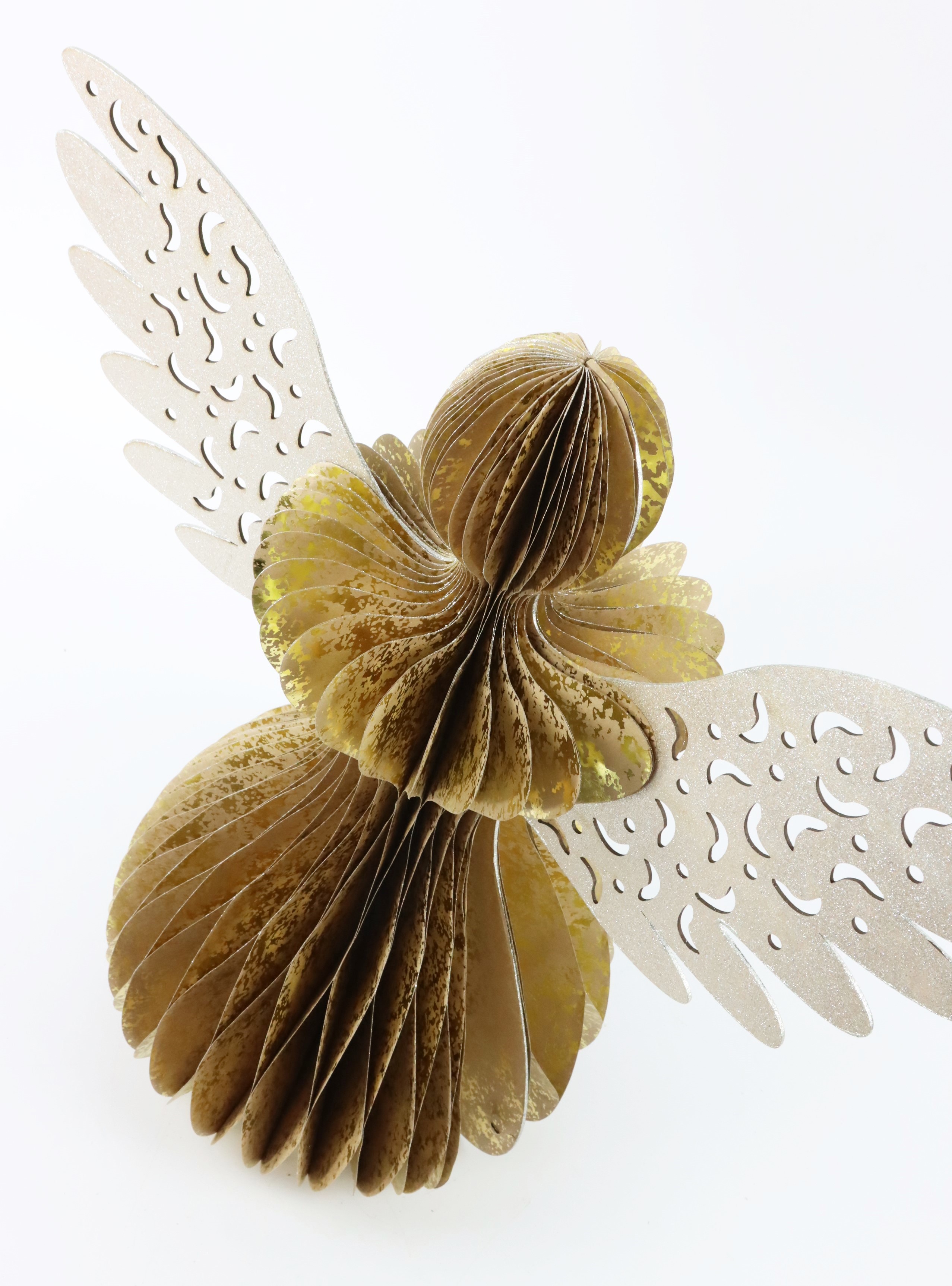 - Characteristics: Foldable decorative angel in gold with silver paper wings