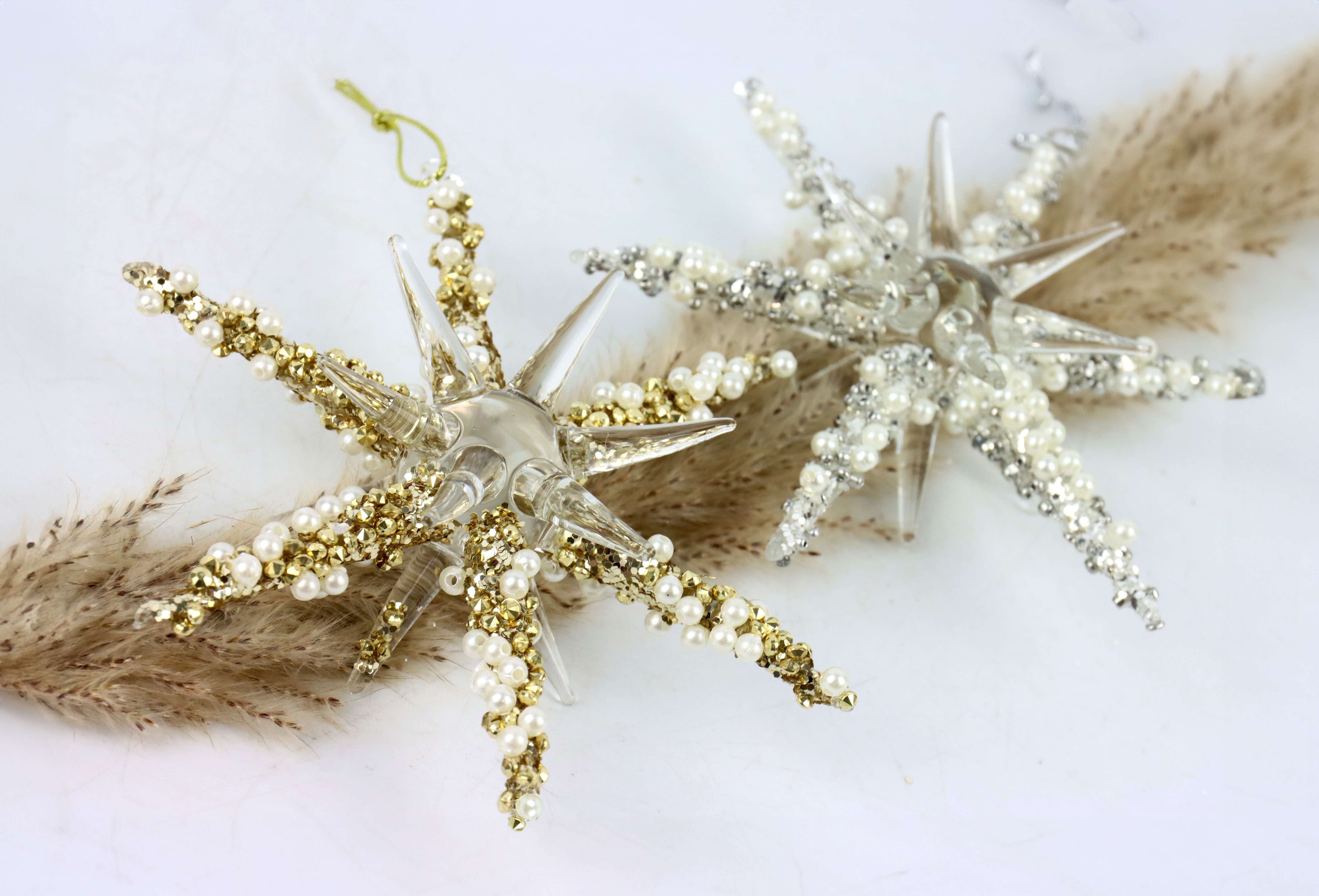 Our 4-piece glass ornament set offers a unique blend of traditional craftsmanship and modern design. Each crystal star is skilfully crafted from glass and will add glamour and elegance to your Christmas decorations. Standing an impressive 12cm tall, these eye-catching glass ornaments are sure to impress your guests at the Christmas party.