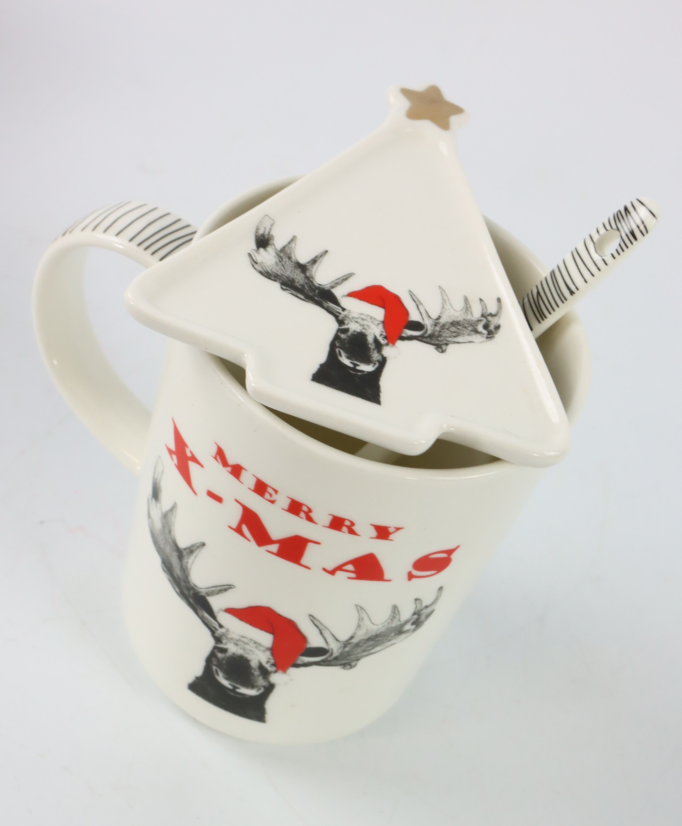 Discover our charming gift set "Funny Moose" S/3, an ideal product for stationary retail in the home and lifestyle sector. This three-piece set embodies pure Christmas cheer and consists of a mug, a Christmas tree plate and a spoon, all skilfully crafted from high-quality porcelain. The adorable Christmas elk motifs give this set its special charm, which will delight your customers at Christmas time.