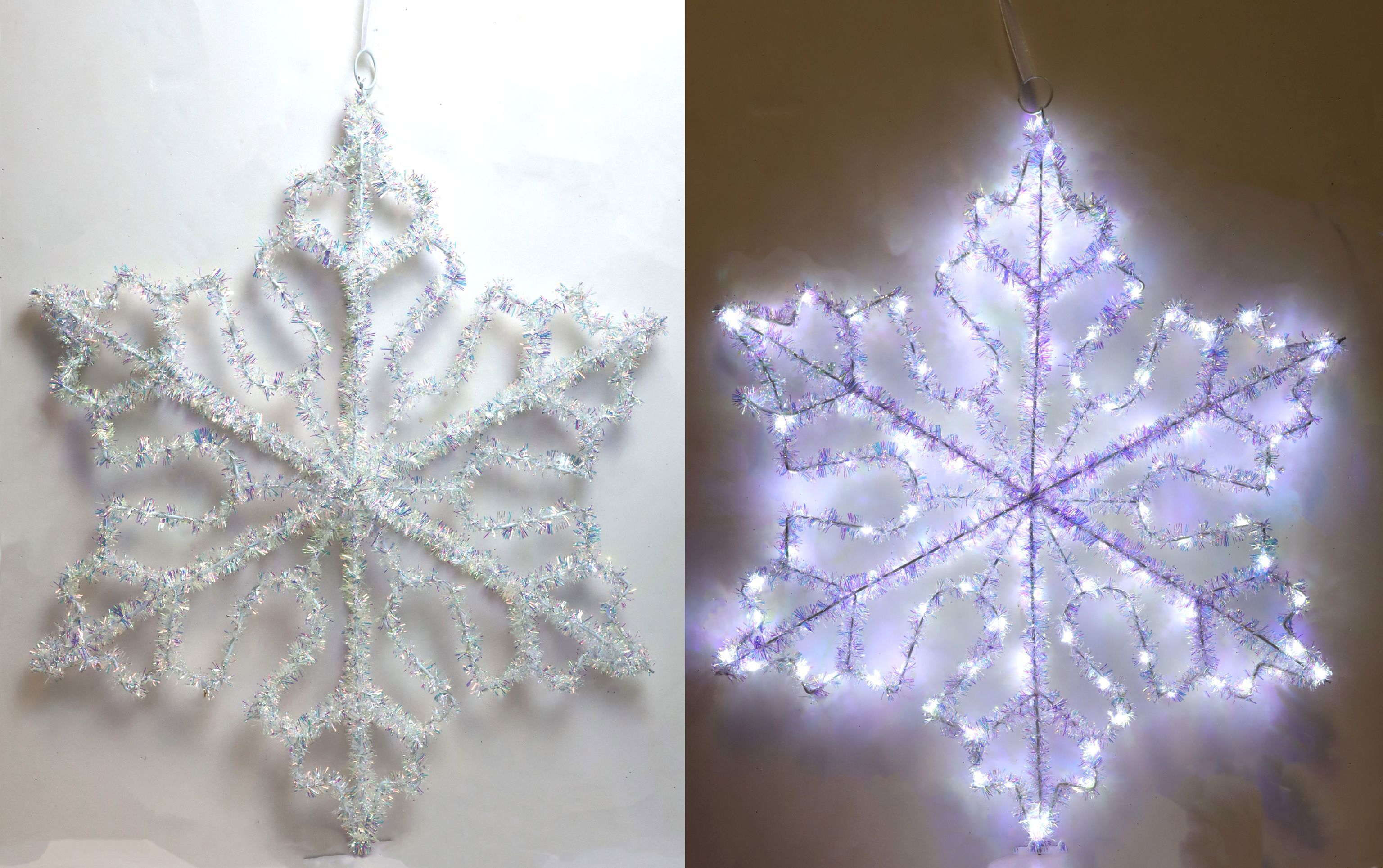 Bring the magical winter wonderland right into your shop with our impressive LED SNOWFLAKE 2-piece set. These Christmas lights are the ideal decoration to add an enchanting festive atmosphere to your home and lifestyle retail store. With an impressive size of approx. 80 cm, the snowflakes made of high-quality plastic and metal offer a breathtaking sight both during the day and at night.