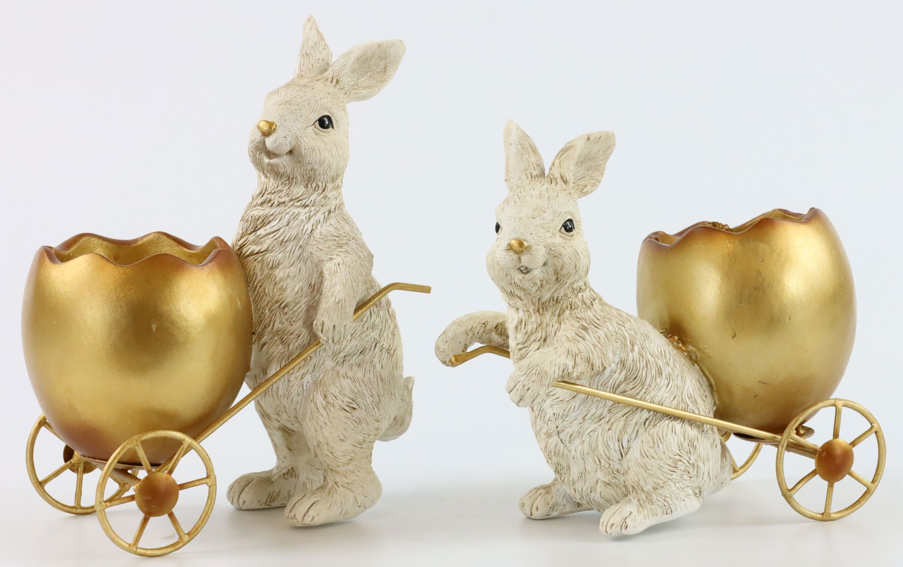 EN**Product description: Figures "Racing Rabbits" S/2 for Easter - Decorative bunnies with egg wheelbarrow made of polyresin**