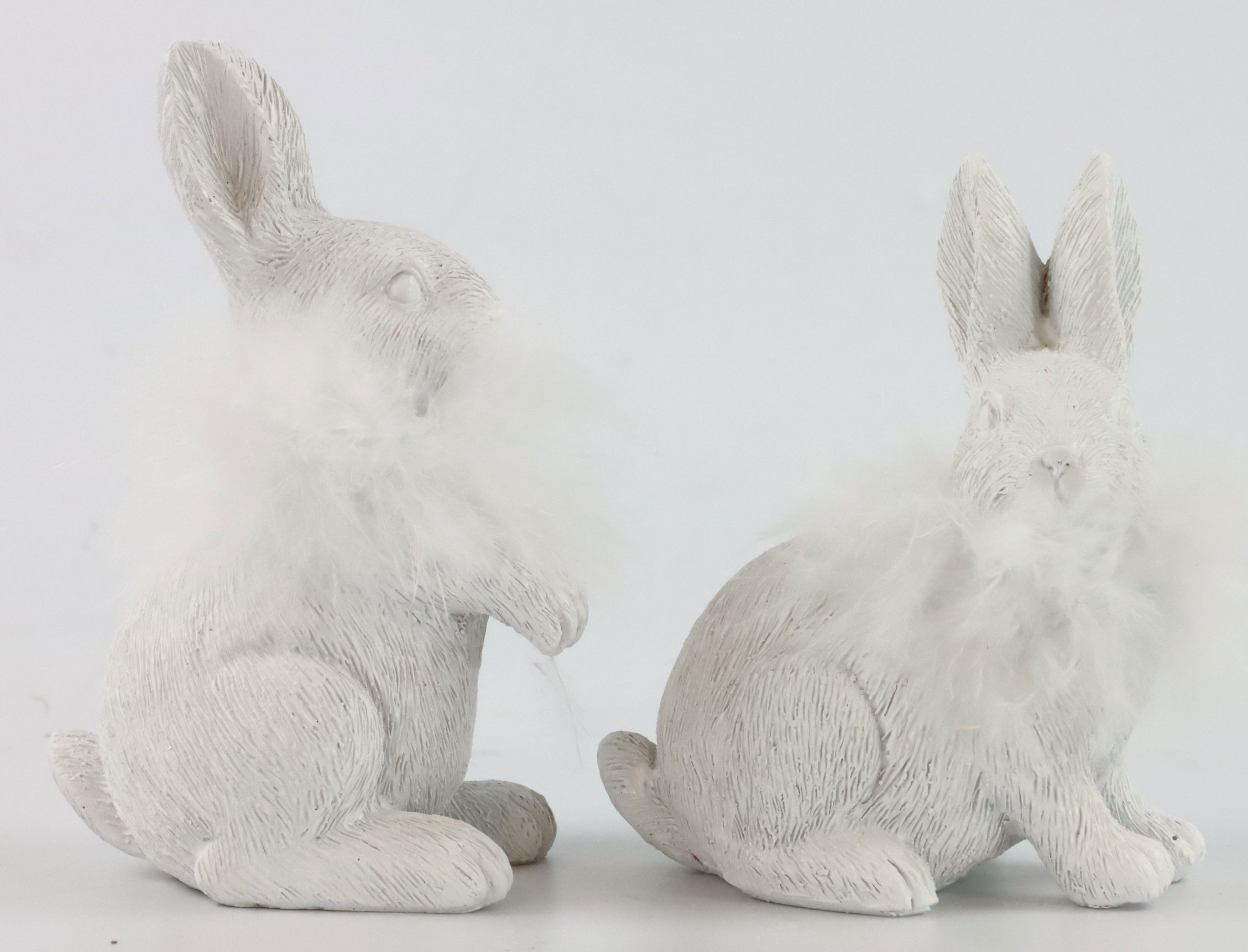 Both bunnies in the set are an elegant white colour and feature delicate feathers, giving them a unique, feather-light appearance. The figures are approx. 12 cm and 10 cm high and harmonise perfectly with each other to create an aesthetic balance in the decoration. This duo is ideal for subtly bringing the lightness and freshness of spring into your business premises.