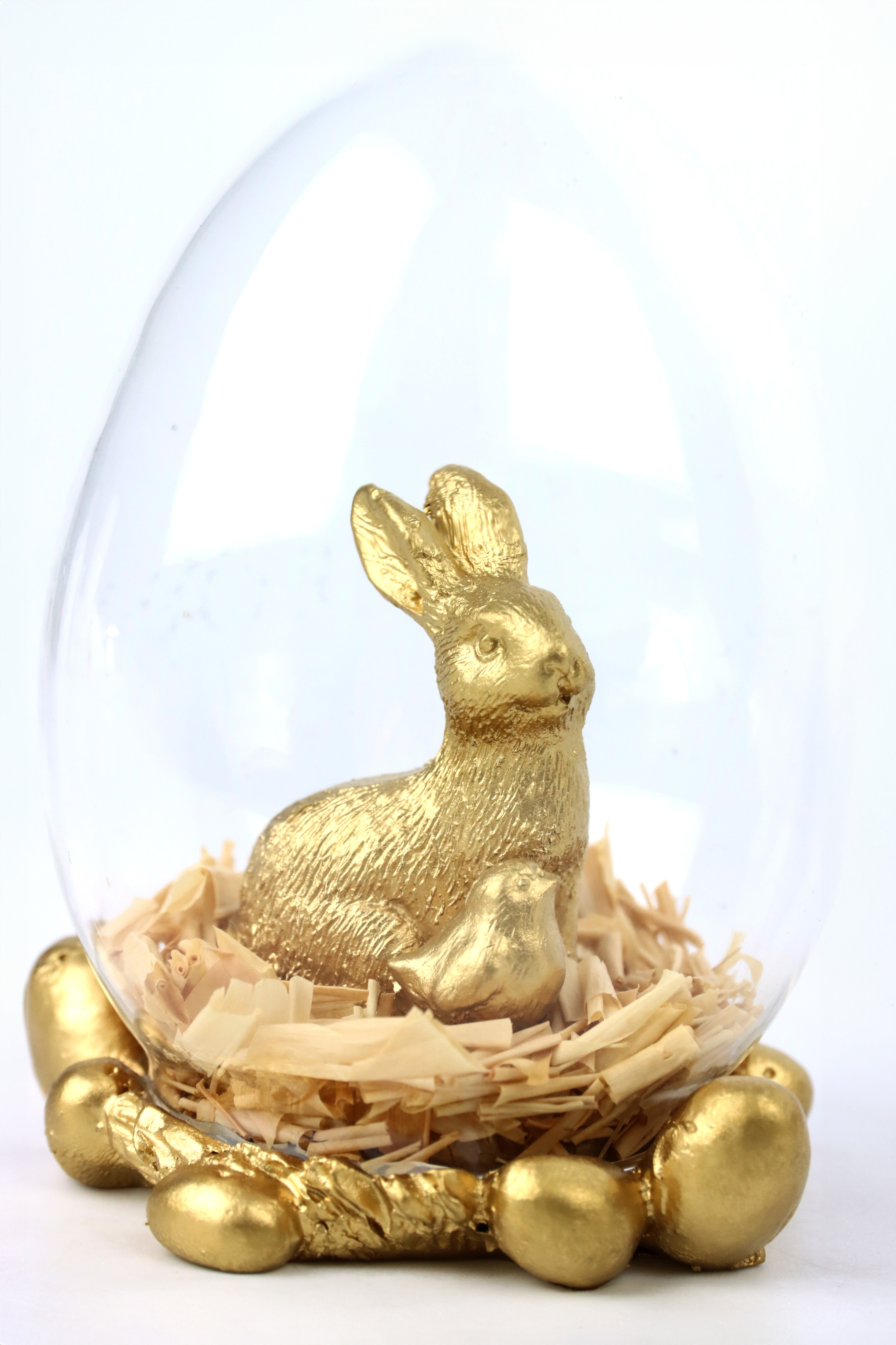 - Set consists of three glass eggs with polyresin gold bunny