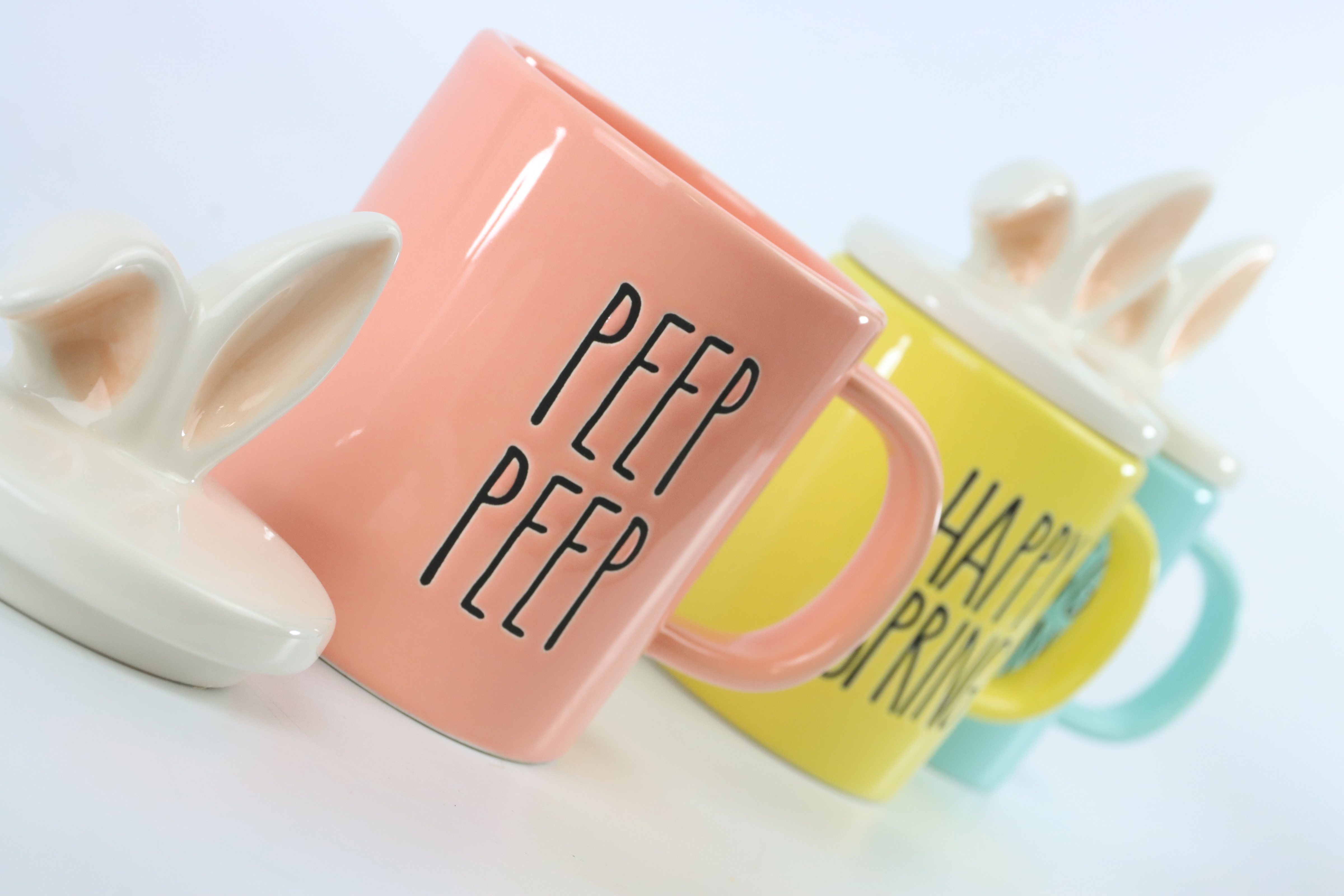 - Three high-quality ceramic mugs with lids in "Candy Easter" design