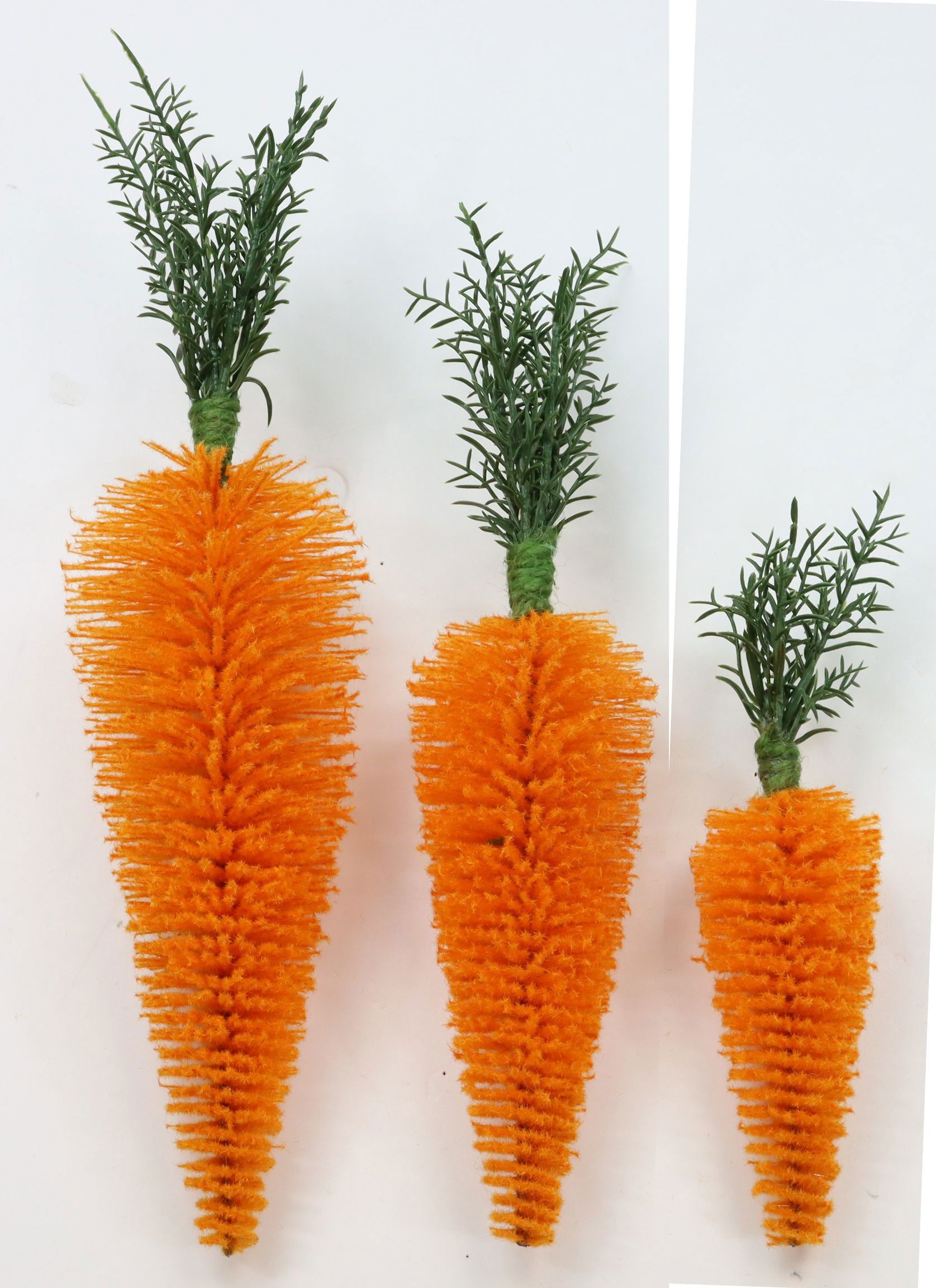 Add a fresh and colourful touch this Easter with the delightful CARROT TRIO "FELIZ" S/3. This charming set, consisting of three artificial carrots in sizes 38 cm, 32 cm and 24 cm, is the perfect decoration for any retail space in the home and lifestyle sector. Made from robust plastic, this trio of carrots offers a durable and easy-care option for creating Easter accents and an appealing design for your shop windows or display areas.