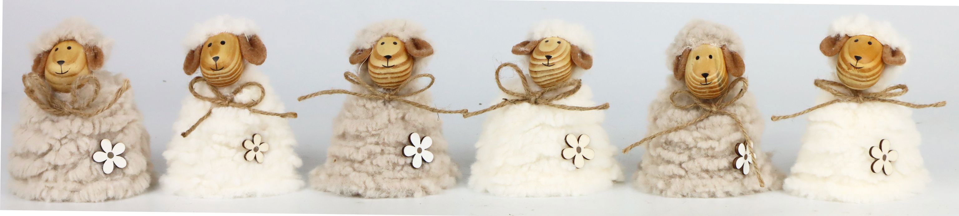 ENDiscover the magical Easter atmosphere with our exclusive "Happy Sheep" egg cosy set. This charming set of six egg cosies, lovingly crafted from high-quality materials, will bring a touch of cheerfulness to any table. Our egg warmers are made of soft faux fur, modelled on a fluffy sheep, and a sturdy wooden core for durability. With a height of approx. 9 cm, they are the ideal addition to a stylish Easter decoration.