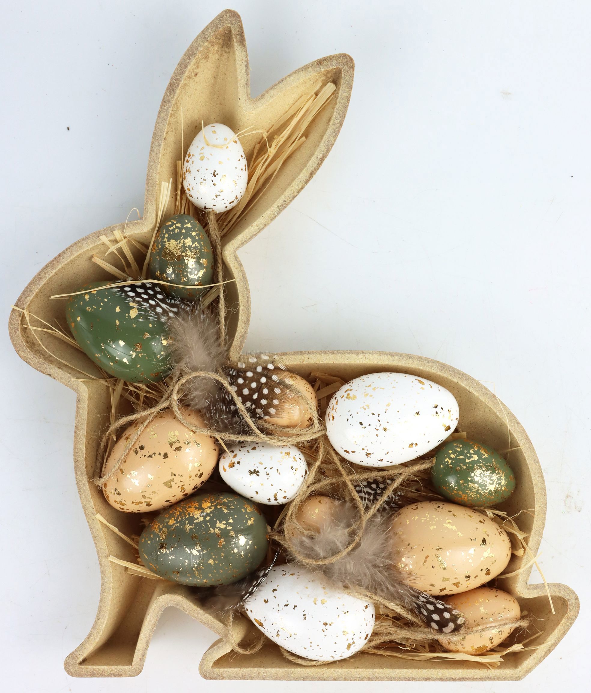 The stylish bunny bowl, with a generous size of around 30 cm, is the centrepiece of this Easter decor set. Made from a high-quality material mix of wood and plastic, it combines natural elegance with timeless durability. The bowl has a neutral, natural design that perfectly reflects current trends in eco-chic and sustainable decoration.