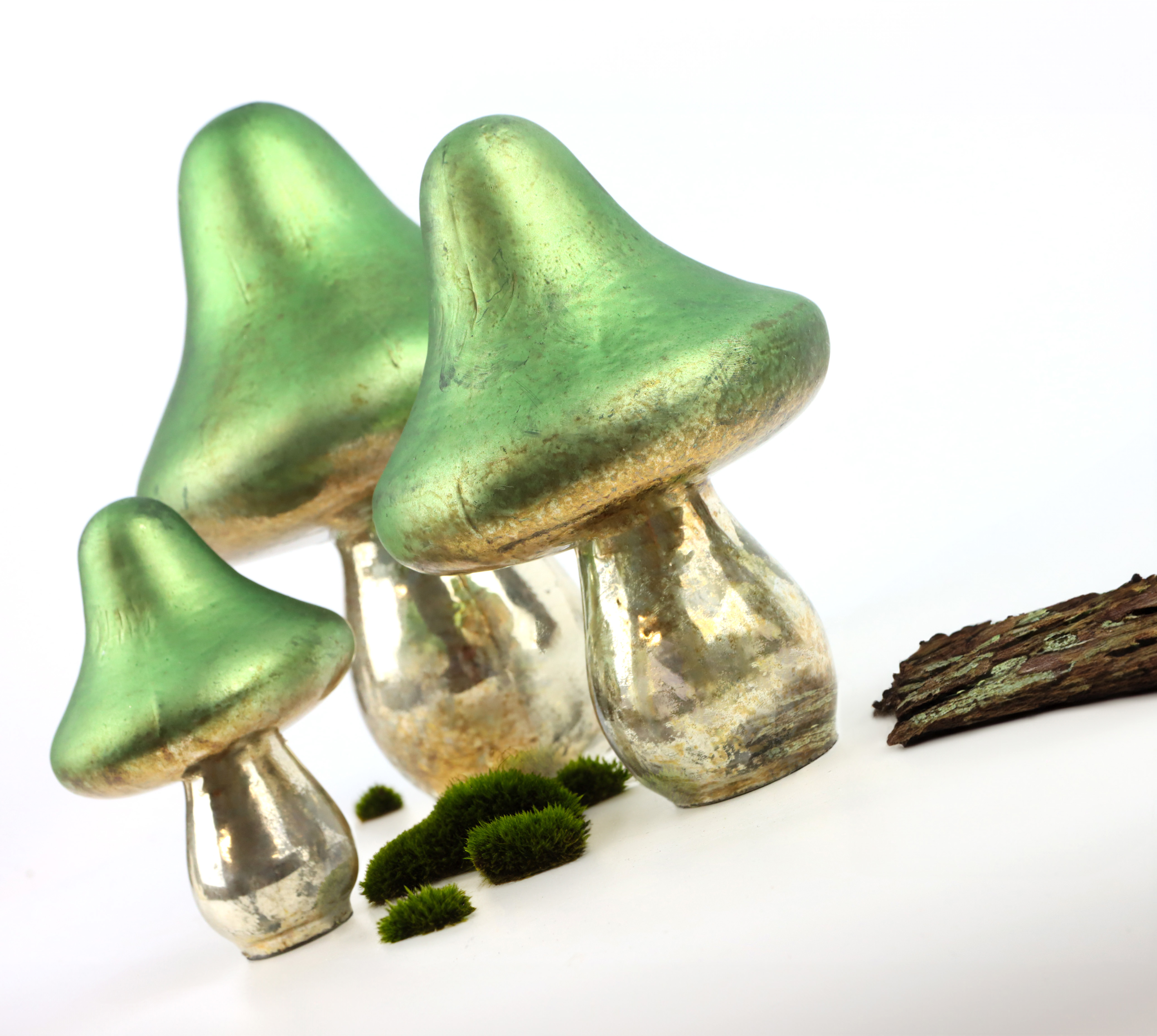 ENImpress your customers with our stylish GLASS MUSHROOMS "VERDE" S/3 - an essential piece for any autumn or winter living environment. This 3-piece set, consisting of handmade glass mushrooms in different sizes (22.5cm, 16.5cm and 13cm), offers a charming way to integrate the nature theme into living spaces and creates a cosy atmosphere in the cold half of the year.