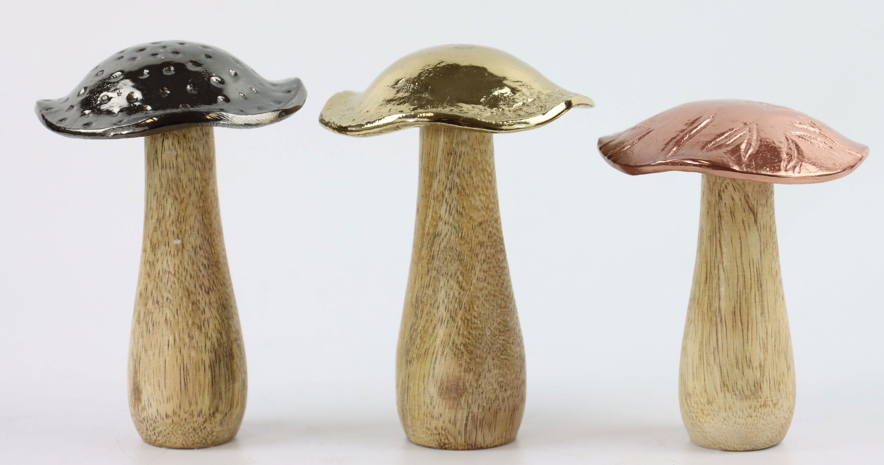 SEO-relevant keywords: decorative mushrooms ZAUBERWALD; 3-piece decorative mushroom set; item number 8560; autumn and winter decoration; aluminium and wood decoration; living and lifestyle product; natural table decoration.