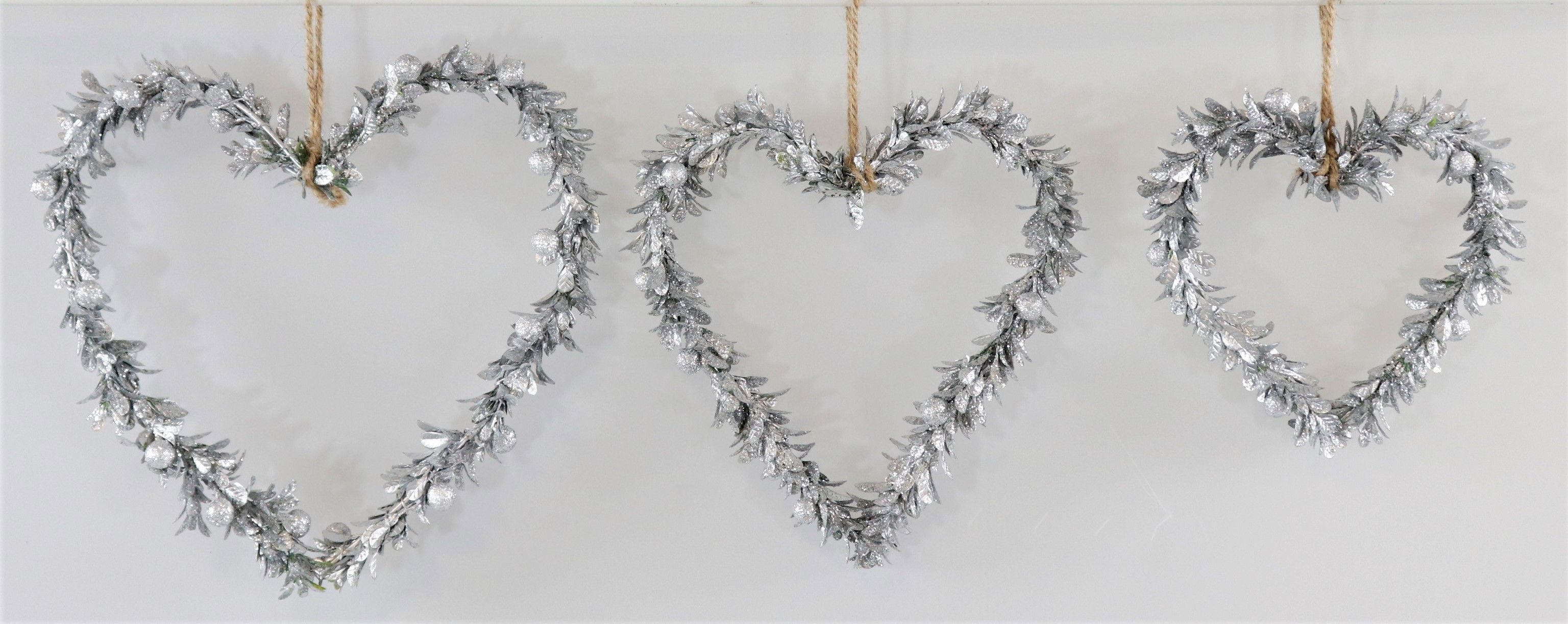 Discover the perfect addition to your winter decorations with the 3-piece set of "Laurel" decorative hearts. Specially developed for stationary retail in the home and lifestyle sector, these decorative wreaths are ideal products for your Christmas collection and bring festive glamour to any ambience. With a charming and high-quality design made from a combination of polystyrene, metal, plastic and wood, the hearts shine in an elegant silver colour. The three sizes - approx. 18 cm, 24 cm and 28 cm - offer versatile decoration options to round off your range.