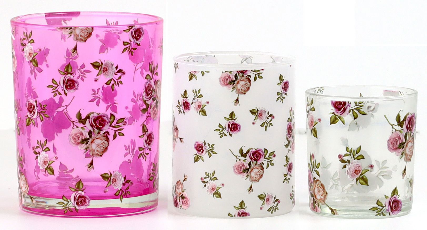 Les photophores "Rose Romance" séduisent par leur taille harmonieuse en trois variantes : avec un diamètre de 10 cm, 8 cm et 7 cm. Que ce soit pour décorer une table dans le salon, sur la terrasse ou dans la vitrine de votre magasin, ce set parvient à enrichir même les espaces à la décoration minimaliste d'un magnifique jeu de lumière. La douce brillance des verres, ornés de motifs de roses romantiques, crée une atmosphère chaleureuse et accueillante que les clients adoreront.