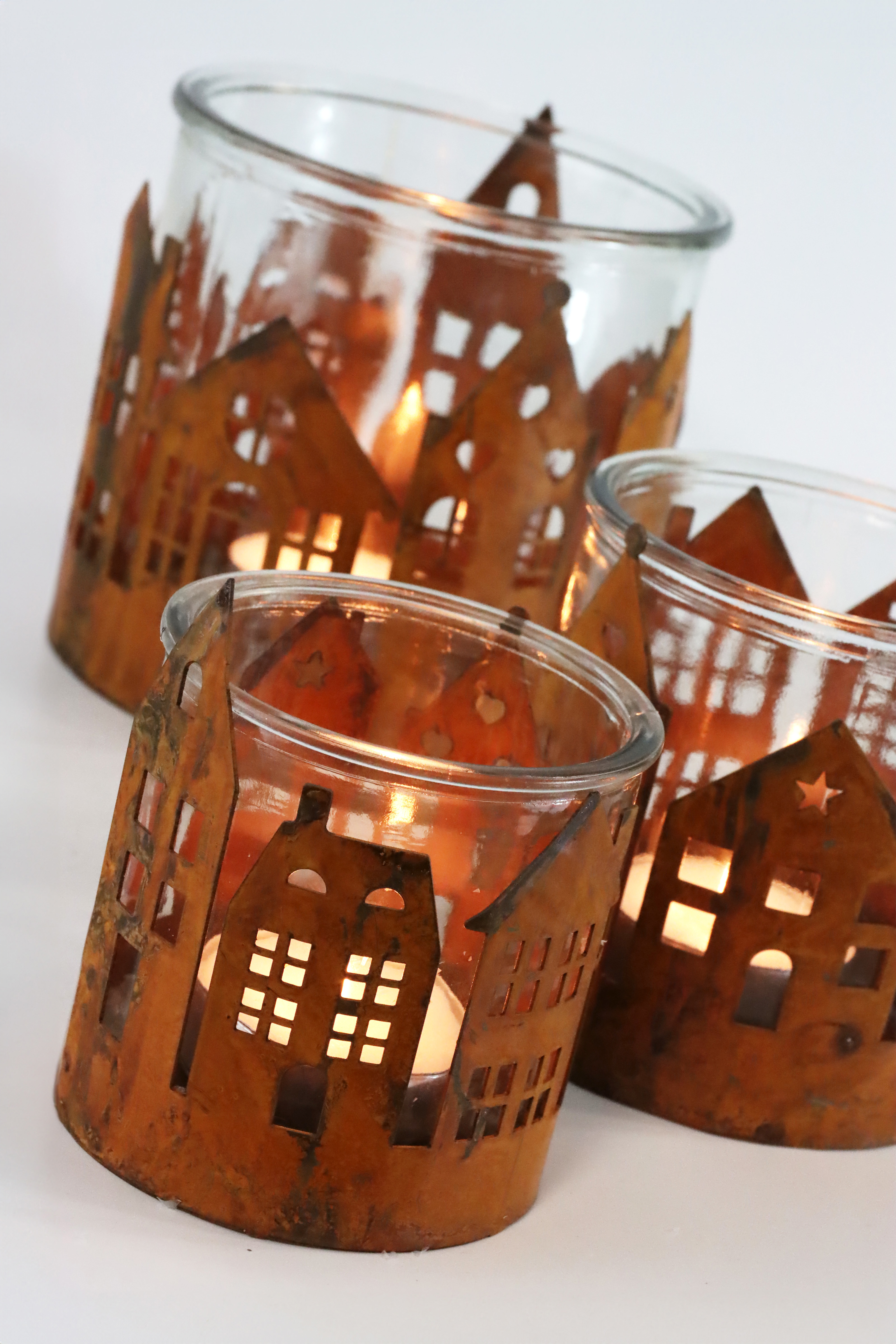 Ogni lanterna del set "La Ville" è realizzata a mano e irradia artigianalità e bellezza. Le case in metallo che circondano il vetro sono state progettate con cura e forniscono una struttura accattivante e intrigante. Quando si accende una candela, si crea un magico gioco di luci e ombre che illumina i dettagli delle casette di metallo e li proietta nella stanza, creando un'atmosfera rilassante e calda.